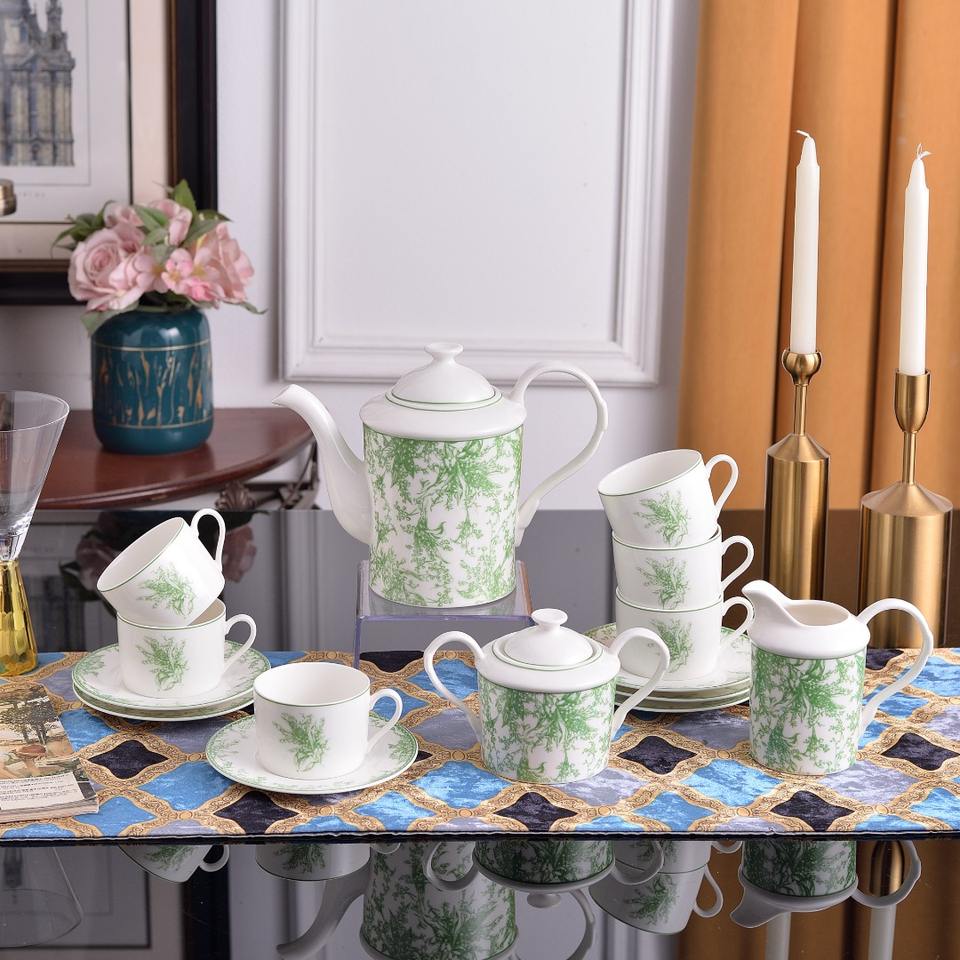 ชุดกาแฟเซรามิกหรูหราลายดอกลิลลี่ออฟเดอะแวลลีย์สีเขียวใหม่ 15 ชิ้น และชุดน้ำชาโบนไชน่า