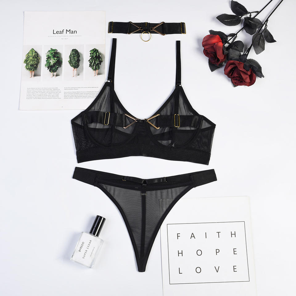 เซ็ตชุดชั้นในแบบสายรัดคอสำหรับผู้หญิงชุดชุดชั้นในตาข่ายซีทรูเร้าอารมณ์เซ็กซี่ใหม่