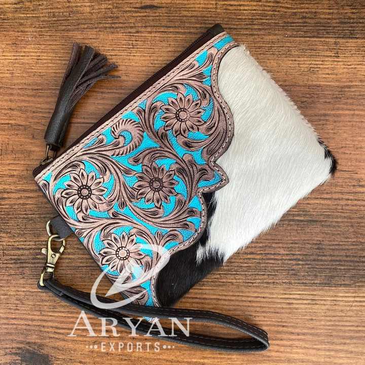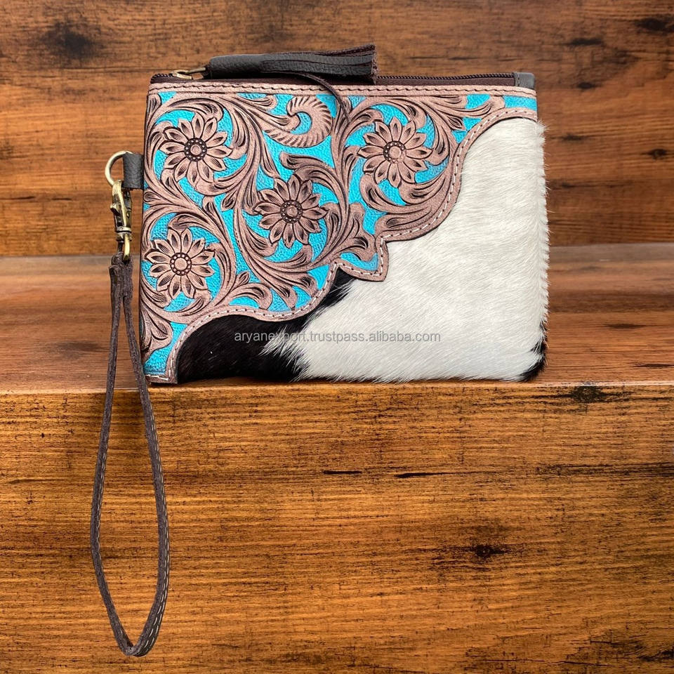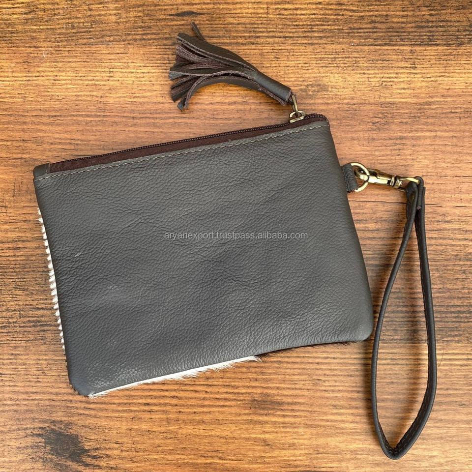 กระเป๋าเครื่องสำอางหนังวัวแบบมีซิปใช้มือใหม่สำหรับผู้หญิงกระเป๋าคลัทช์มีสายคล้องข้อมือหนังแท้มีพู่