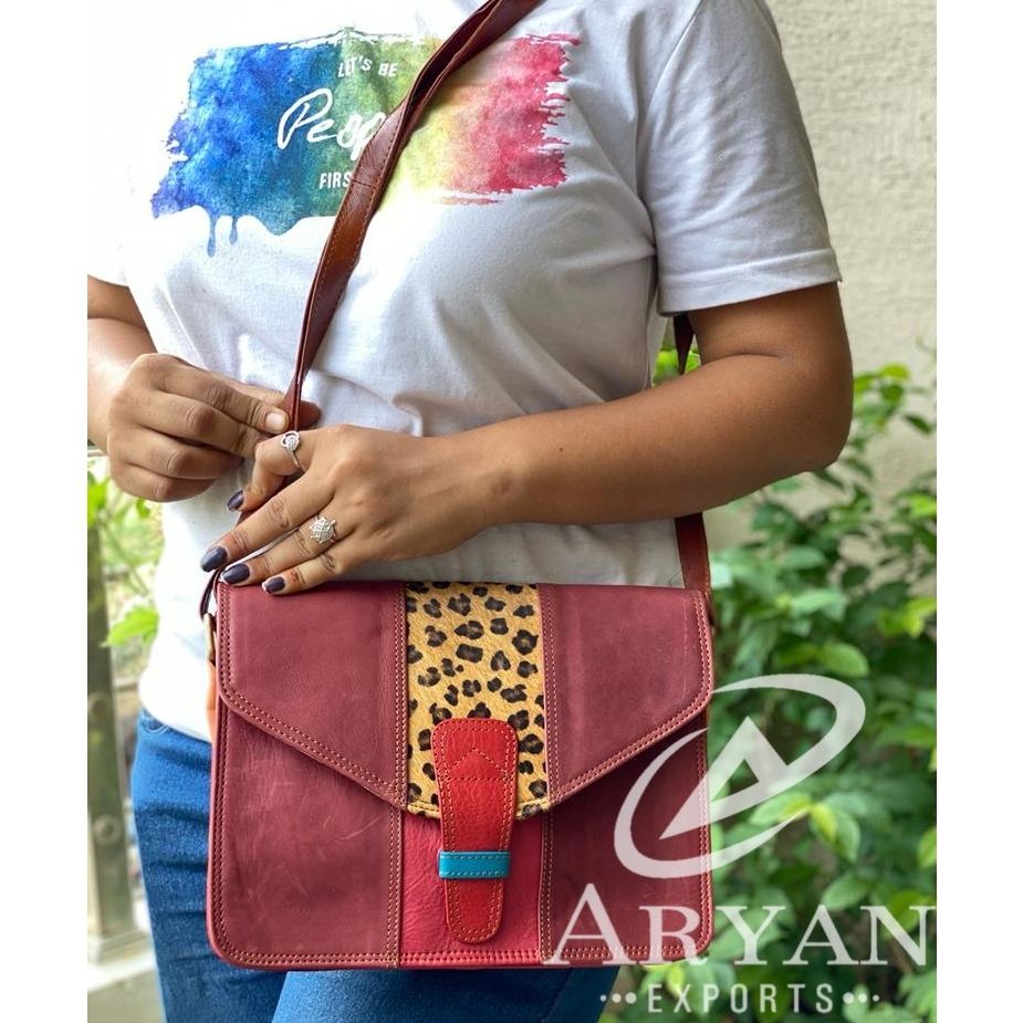 New Handcrafted Women Genuine Recycled Animal Print Fur Leather Stubby Color Handbag Unique Rainbow Color Shoulder Crossbody Bag