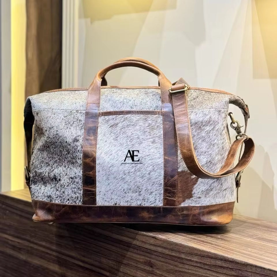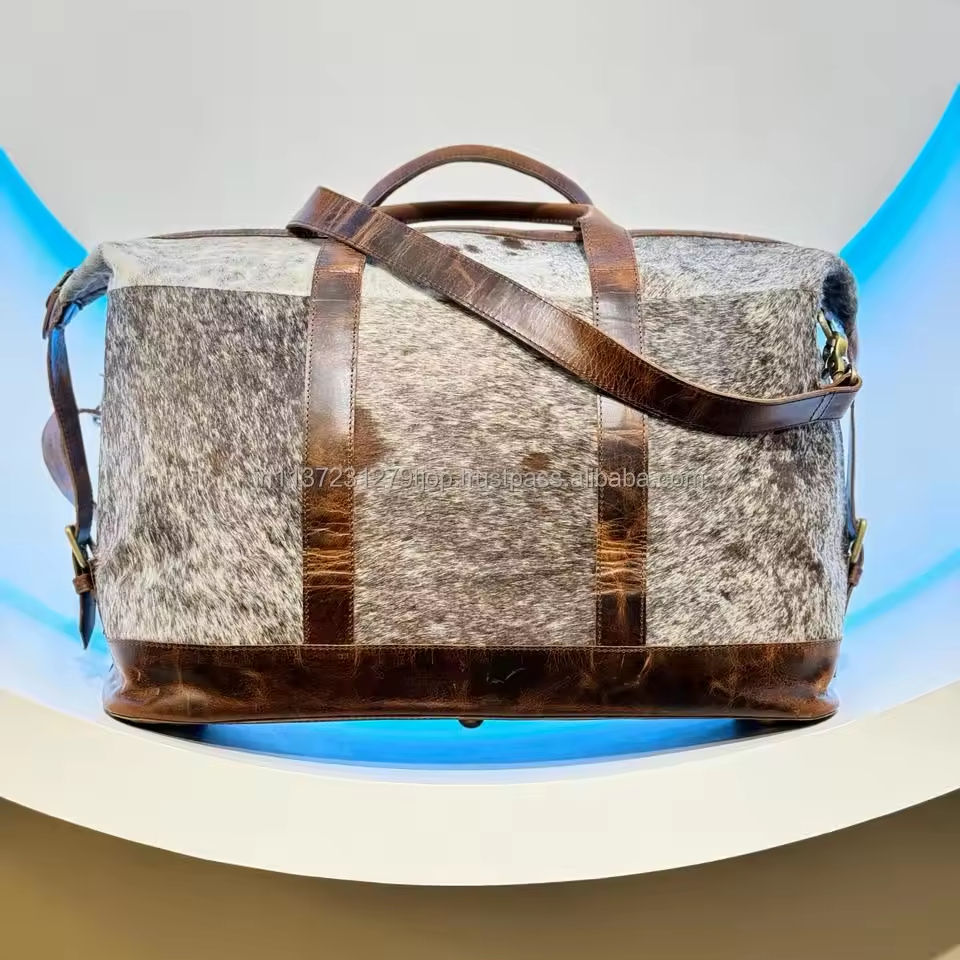 ใหม่ทําด้วยมือ 100% ผมธรรมชาติบน Cowhide Duffle กระเป๋าหนังแท้มีสไตล์กระเป๋าเดินทางที่สมบูรณ์แบบกระเป๋าสัมภาระตะวันตกสําหรับ U Nisex