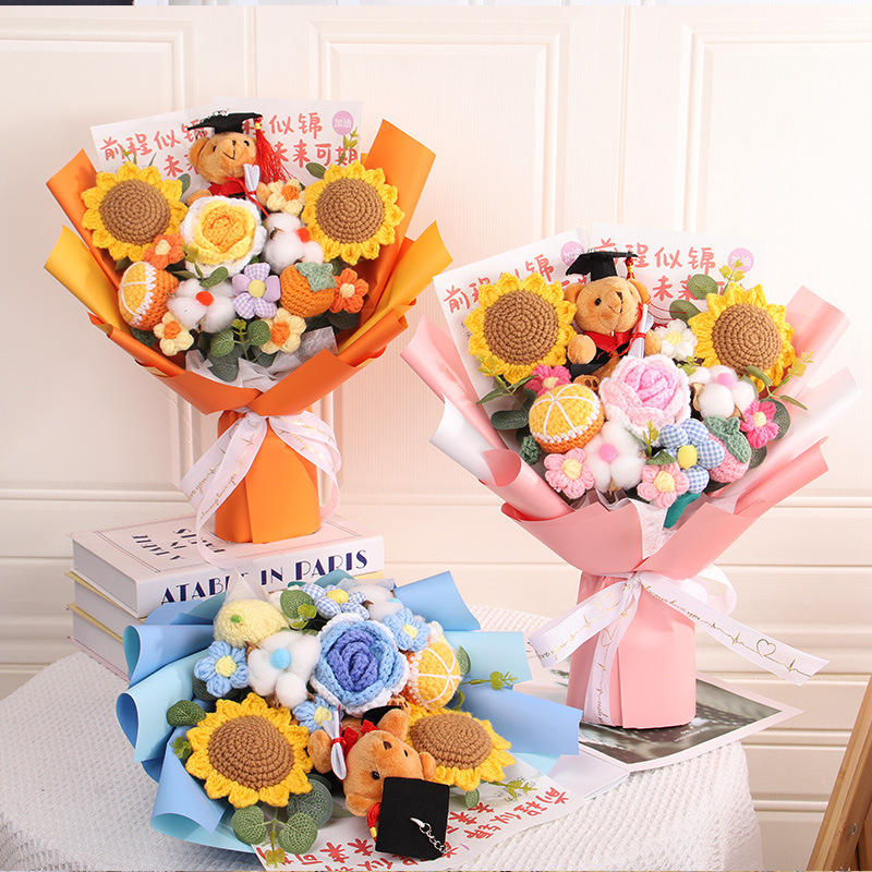 ช่อดอกไม้ถักโครเชต์ทำมือใหม่ ของขวัญวันครู ดอกทานตะวันถักโครเชต์