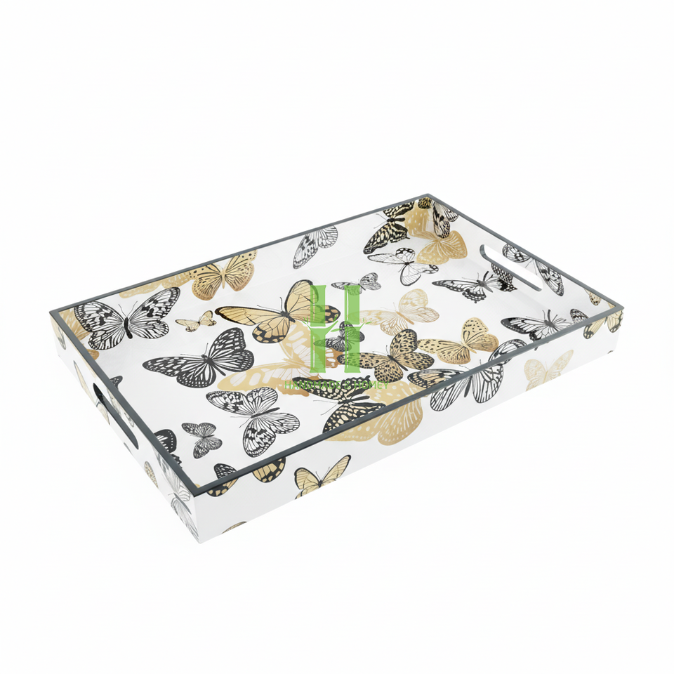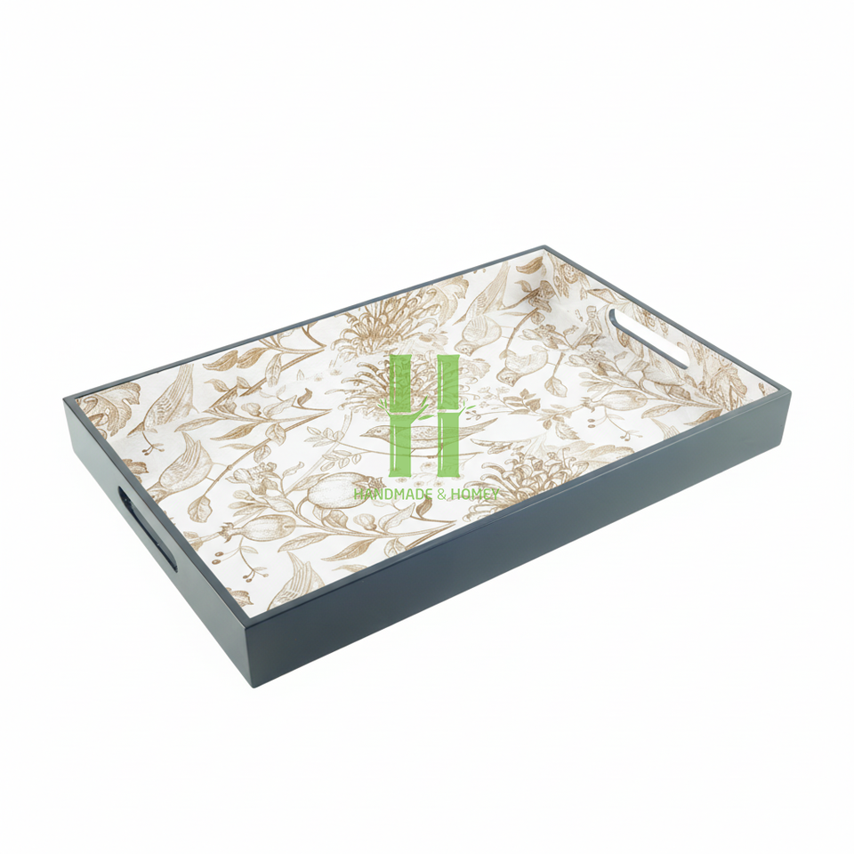 ถาดเสิร์ฟทรงสี่เหลี่ยมผืนผ้าทำมือจาก MDF พร้อมหูจับอเนกประสงค์ ใช้ตกแต่งโต๊ะอาหารในครัว