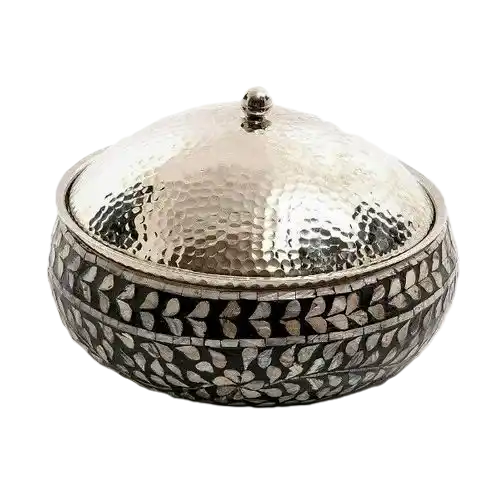 ใหม่แฮนด์เมดโลหะเสิร์ฟหม้อไฟออกแบบที่กําหนดเองตกแต่งหรูหราหม้อทรงกลมแฟนซีอุ่นอาหาร Hammered ฝาปิด