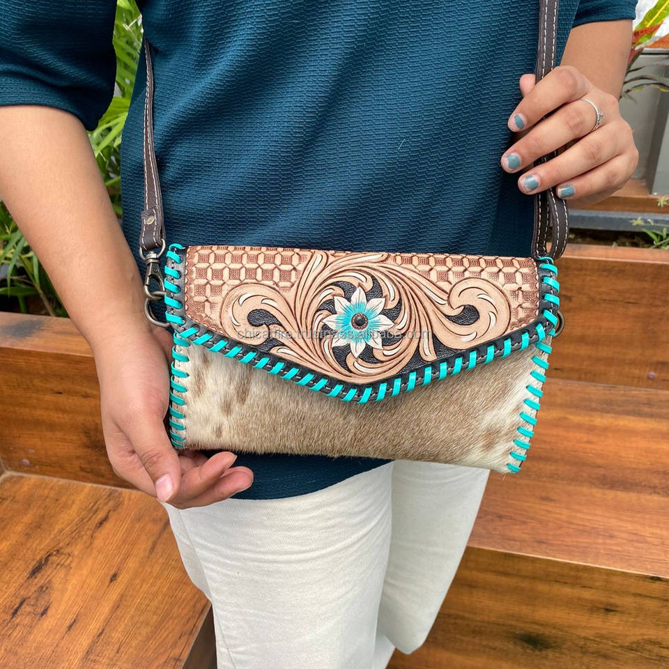 กระเป๋าเงินแบบสะพายข้างทำด้วยมือทำด้วยมือสำหรับผู้หญิงกระเป๋าใส่บัตรลายดอกไม้หนังวัวสไตล์ตะวันตกสีเทอร์ควอยซ์สำหรับเดินทาง