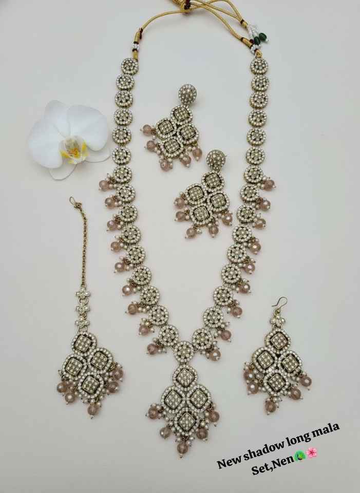 ชุดเครื่องประดับทองแดงชุบทองคุณภาพสูงสไตล์วินเทจแบบคุนดัน สร้อยคอยาวแบบมาลา ต่างหู มงกุฎติดผม ของขวัญสำหรับงานแต่งงาน