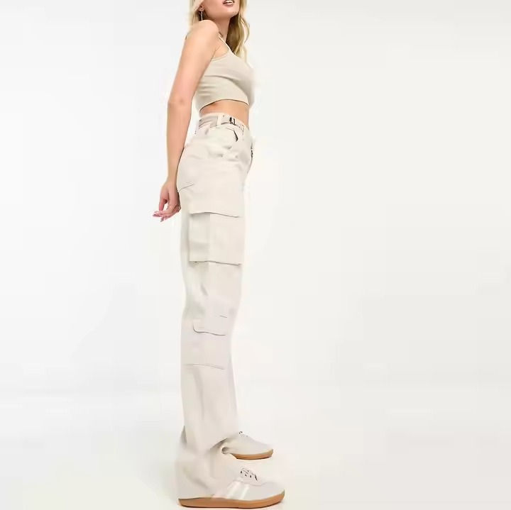 กางเกงคาร์โก้ขายาวสำหรับผู้หญิงกางเกงคาร์โก้สีพื้นทรงหลวมทำจากผ้าฝ้ายออกแบบได้เอง