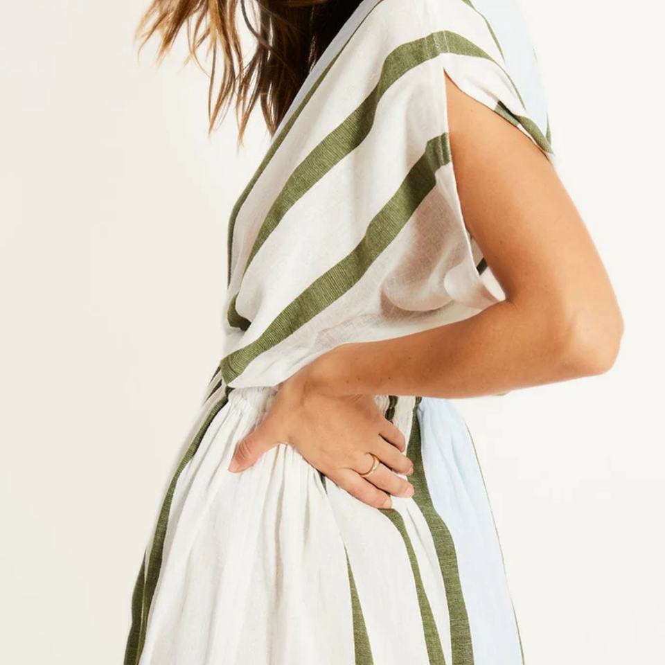 เดรสผู้หญิงขายดีรุ่นใหม่ ผ้าลินินคอตตอนลำลองแฟชั่นสำหรับฤดูร้อน ชุดเดรสฤดูร้อนผู้หญิงแบบสั่งตัดปี 2025 ลายทางความยาวปานกลาง