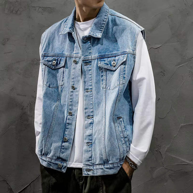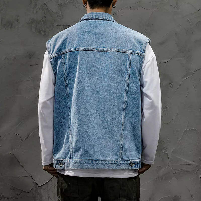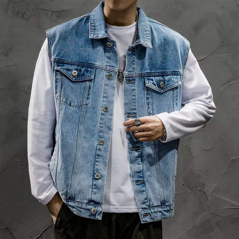 เสื้อกั๊กเดนิมสีพื้นคุณภาพสูงขายดีรุ่นใหม่ แห้งเร็ว สำหรับผู้ชาย แขนกุด สไตล์ลำลอง สตรีทแวร์