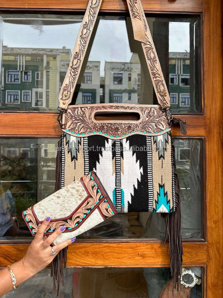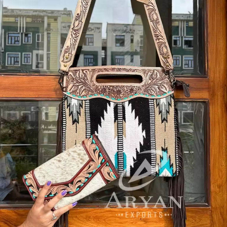 Product name:Vintage Tooled Aztec Leather Handbag & Wallet Combo Set