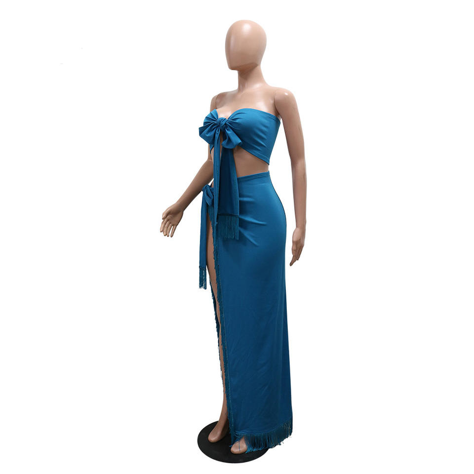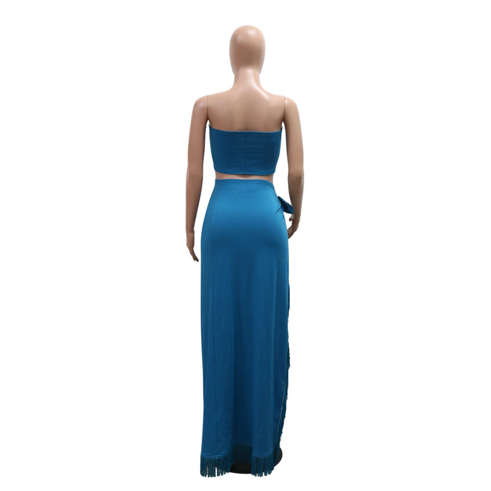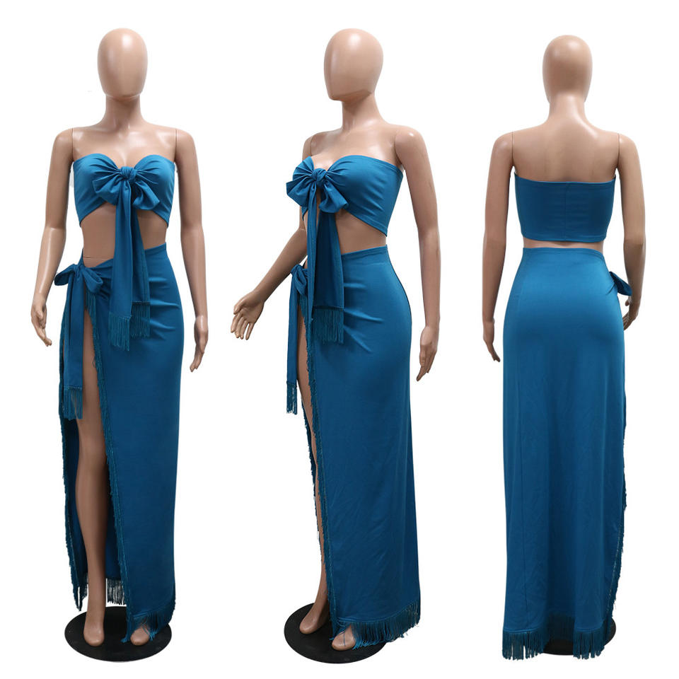 Casual, Solid Color High Split Fringe Dress Two-Piece Setสไตล์