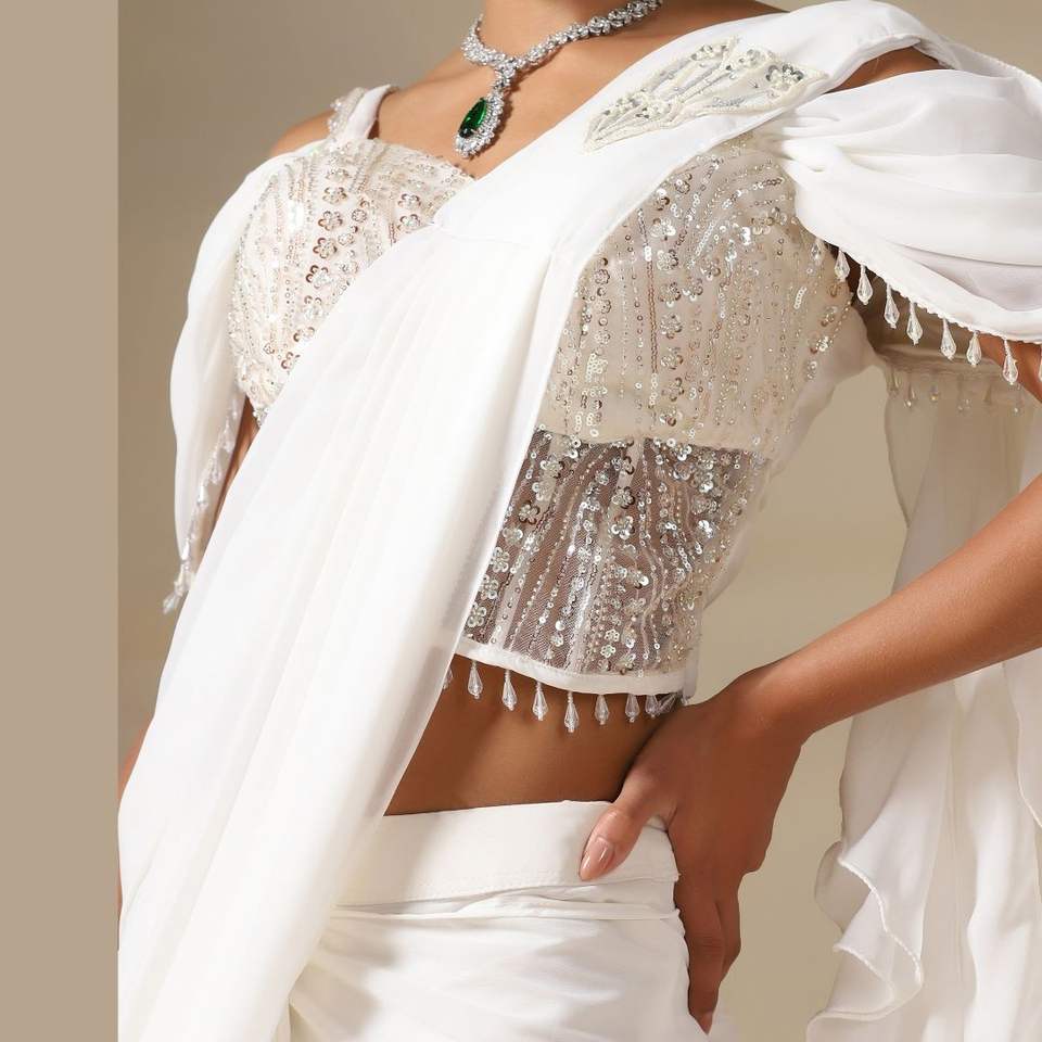 ผ้าจอร์เจียสีงาช้างใหม่พร้อมใส่ส่าหรีพร้อมเต้นหนักสวยงามงานฝีมือและงานปักอย่างดีสำหรับโอกาสพิเศษจากอินเดีย