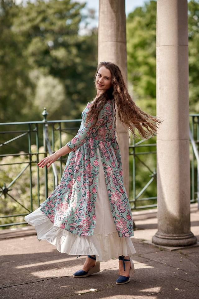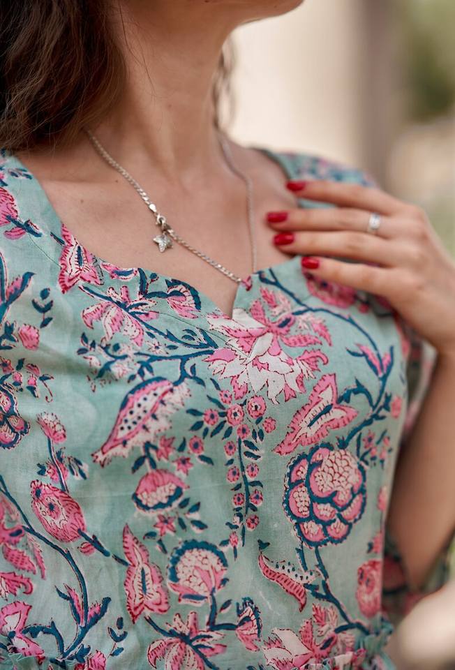 New Kamalani Bohemian Dress Hand Block Printed Cotton White Green Rose Floral Pure Cotton Handmade Ethical Fashion