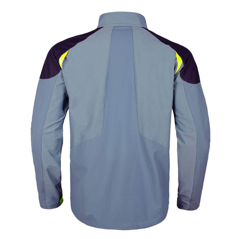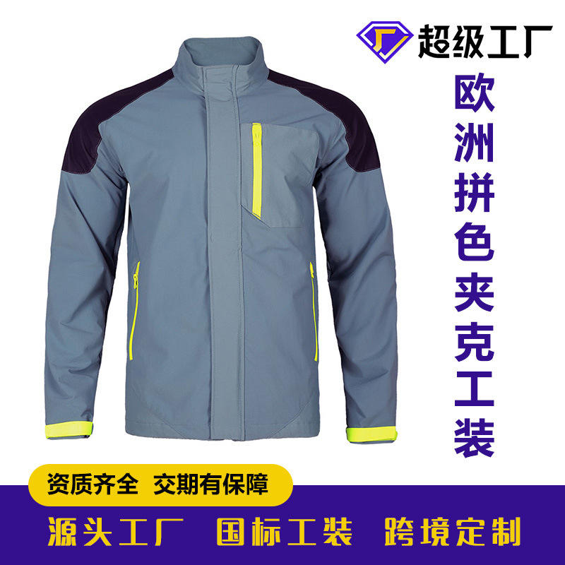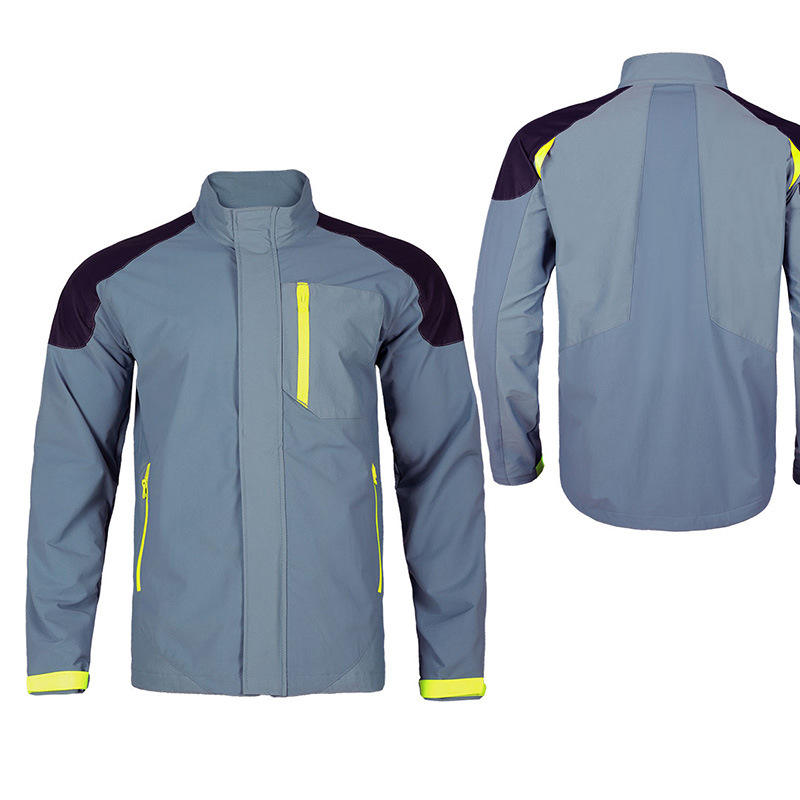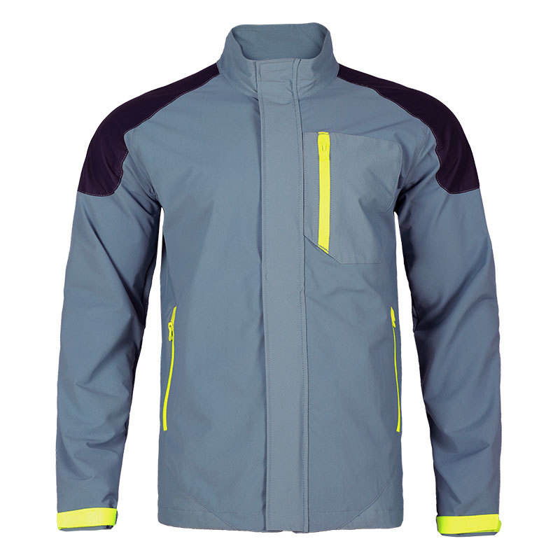 เสื้อแจ็คเก็ตกันลมสำหรับผู้ชายรุ่นใหม่ ฤดูใบไม้ผลิ 2023 สำหรับโรงงาน งานกลางแจ้ง สไตล์สปอร์ต คอตั้ง สีน้ำเงิน แต่งขอบสีเหลือง