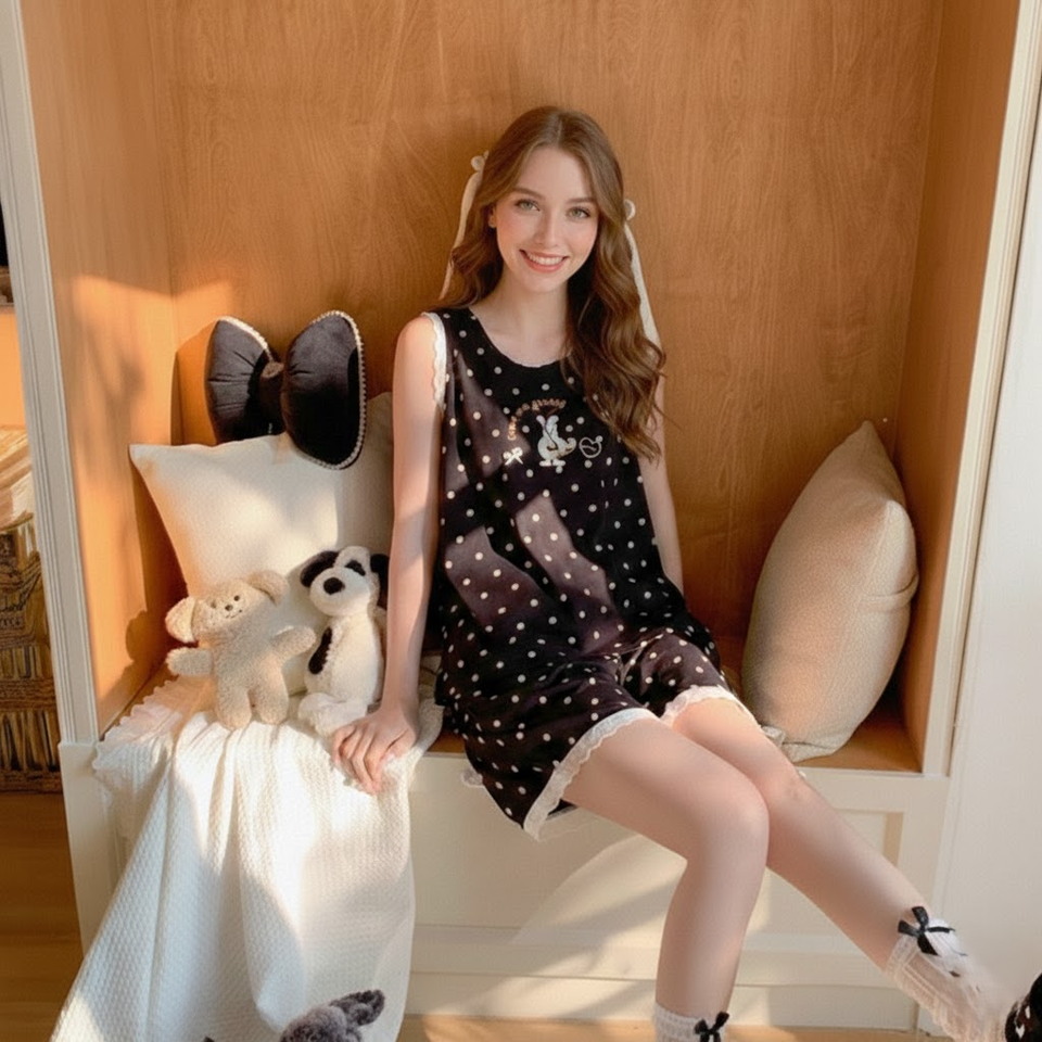 ชุดนอนฤดูร้อนสไตล์เกาหลีแบบใหม่สำหรับผู้หญิง ชุดนอนแขนกุดลายการ์ตูน ชุดนอน 2 ชิ้น
