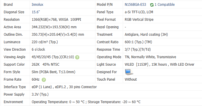 อินเทอร์เฟซ:eDP (1 เลน), eDP1.2, คอนเน็กเตอร์ 30 พิน