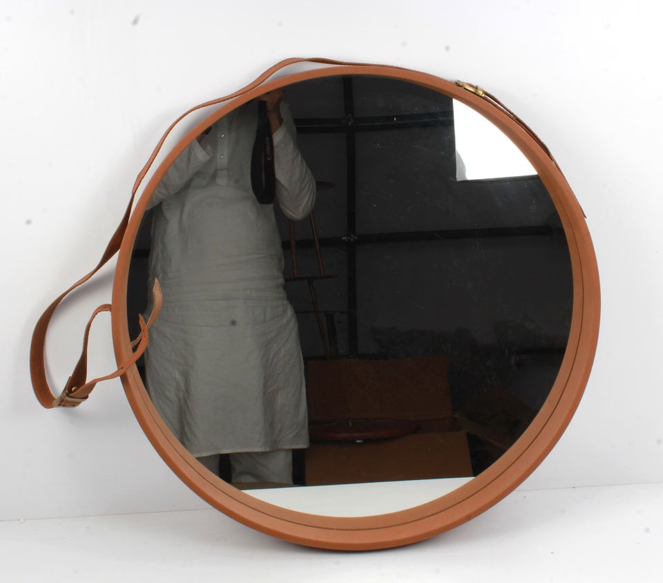กระจกแขวนเหล็กพร้อมหนังสีน้ำตาลติดผนังสินค้าใหม่ล่าสุดผู้ผลิตอินเดียและส่งออก