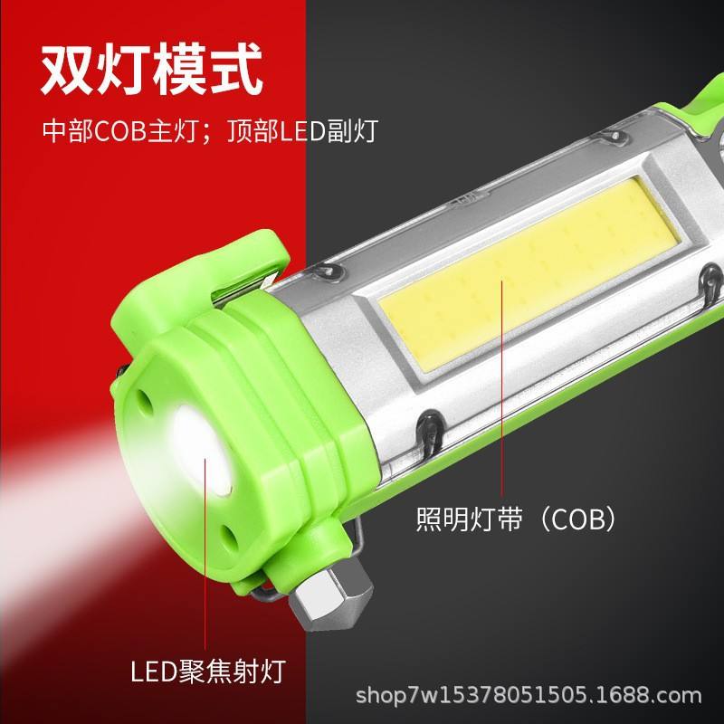 ไฟฉาย LED ใหม่ ค้อนทุบกระจกรถยนต์อเนกประสงค์ ความเข้มสูง ไฟทำงานแบบ COB พร้อมแม่เหล็ก แสงสีเขียว แบตเตอรี่ 1000mAh ชาร์จได้