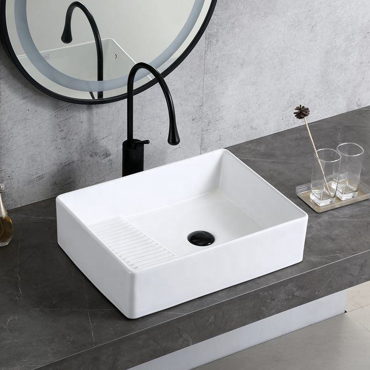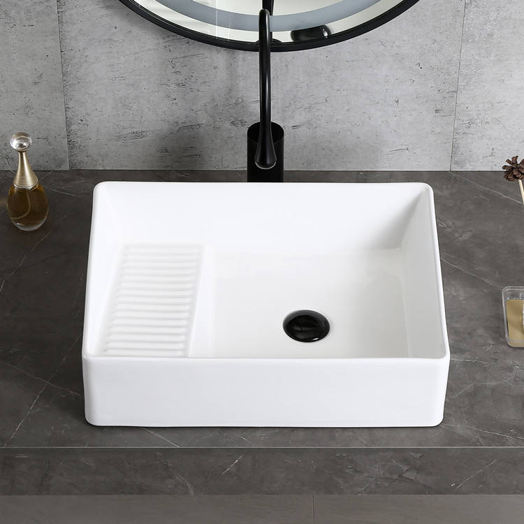 อ่างล้างมือเซรามิกแบบตั้งโต๊ะ พร้อมที่ซักผ้า ด้านซ้ายและขวา มีที่ระบายน้ำ อ่างเดี่ยว สีดำ