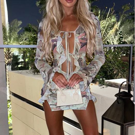 เดรสตาข่ายพิมพ์ลายแขนยาวผูกโบว์ทรงเข้ารูปแฟชั่นสำหรับผู้หญิง
