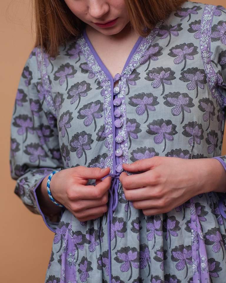 New Lotus Lake Bohemian Midi Dress Pure Cotton Hand Block Printed Lilac Grey Floral | Handmade Ethical Summer Fashion