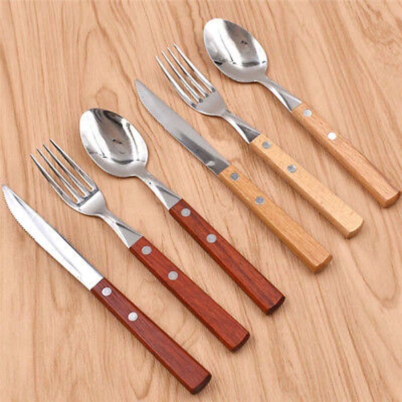 ชุดเครื่องใช้บนโต๊ะอาหารสแตนเลสส้อมช้อนเงินและทองชุดช้อนส้อมด้ามแบนไม้สีแดงและเหลืองเกาหลี