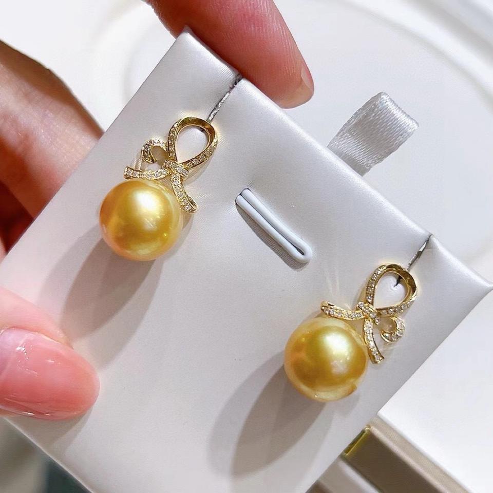 ต่างหูมุกแท้ 100% สไตล์หรูหราใหม่ ขนาด 10-11 มม. รูปทรงกลีบดอกไม้ สีเขียวทอง เนื้อหนา ไร้ตำหนิ ประกายทอง สวยงาม