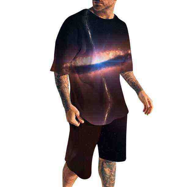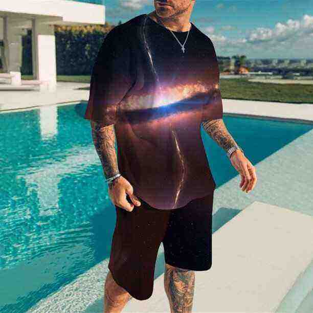 ชุดกางเกงขาสั้นลำลองสำหรับผู้ชายใหม่เซ็ตเสื้อยืดแขนสั้นกางเกงขาสั้นเสื้อยืดพิมพ์ลายซับลิเมชันสีทึบและชุดสั้นคอกลมใช้งานกลางแจ้งสวมใส่สบาย