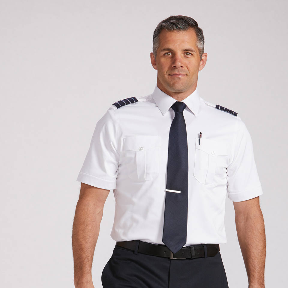 ใหม่ผู้ชายสายการบินเครื่องแบบแขนสั้นเสื้อนักบินสีขาวขายส่งโพลีเอสเตอร์/ผ้าฝ้ายผู้ผลิตเสื้อนักบินจากบังคลาเทศ
