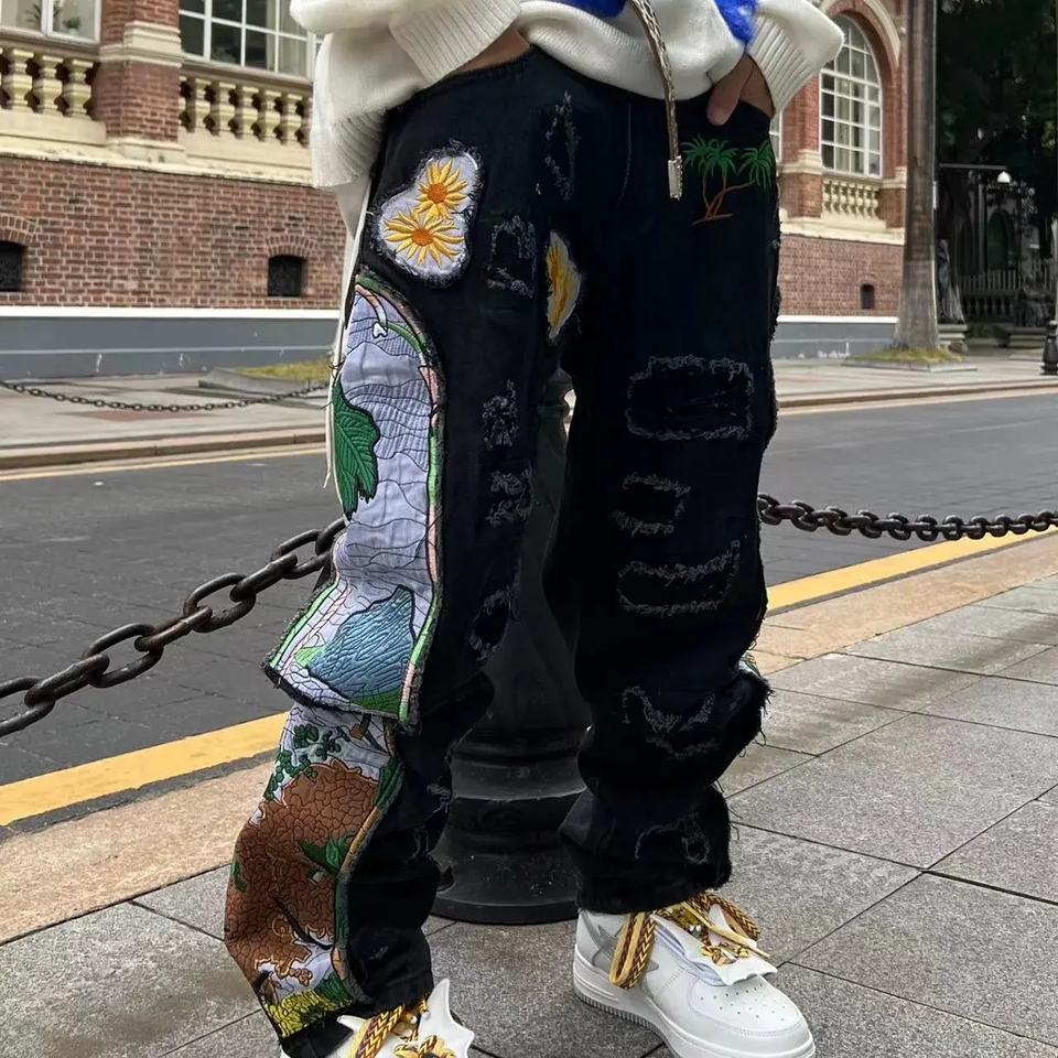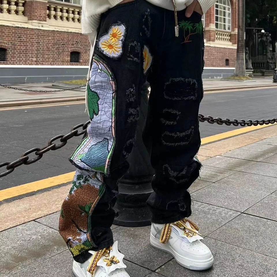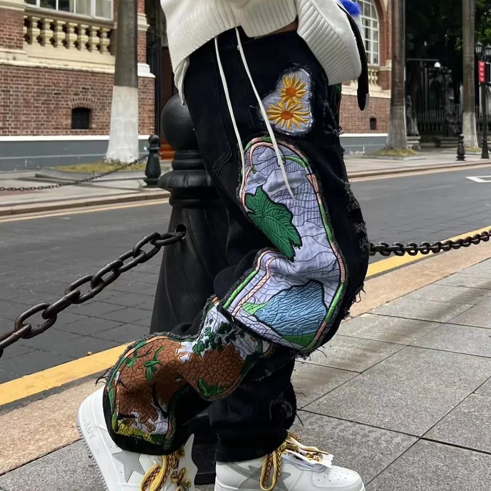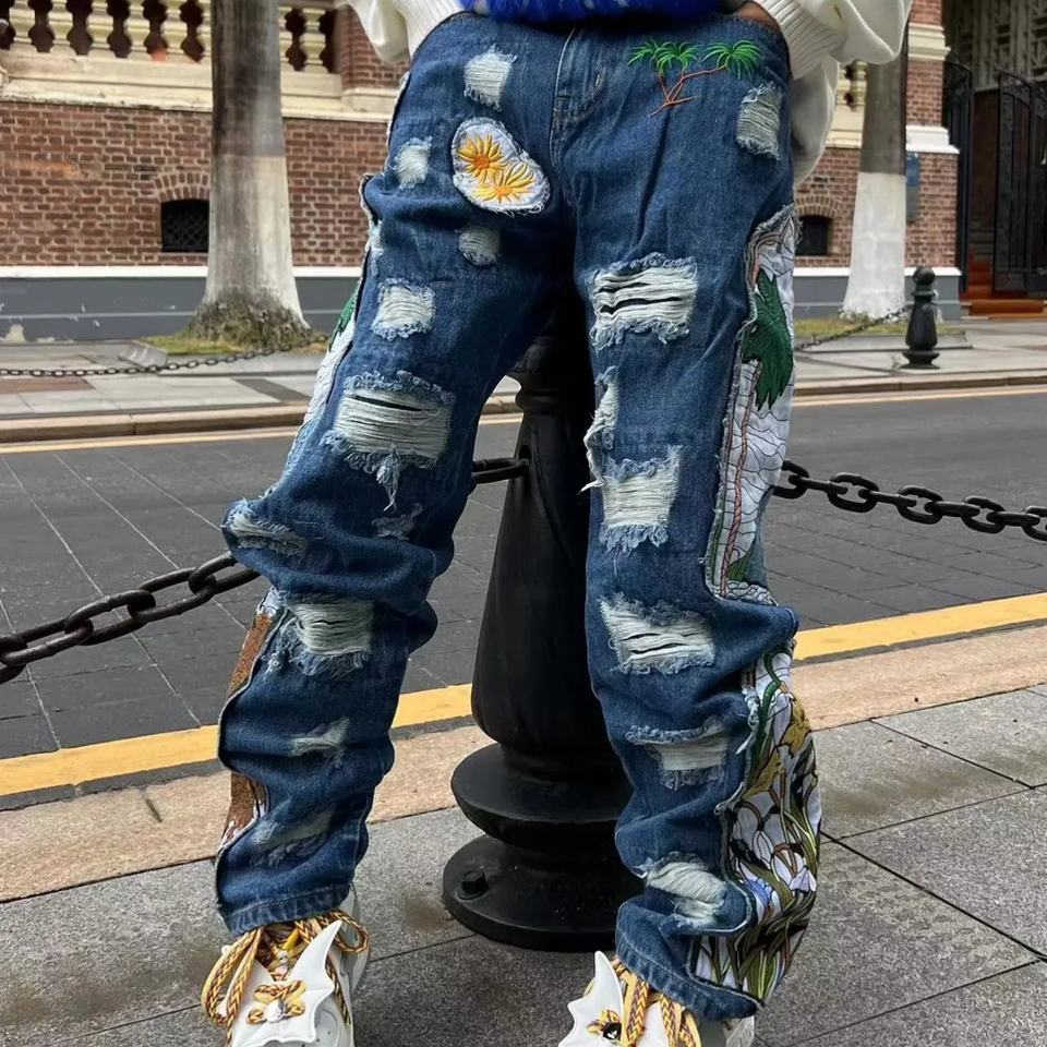 กางเกงยีนส์สไตล์ศิลปะใหม่สำหรับผู้ชาย - ดีไซน์ปะปักลายแบบย้อนยุค ลุคยีนส์ฟอกสี เหมาะสำหรับเทรนด์แฟชั่น Y2K บนท้องถนน