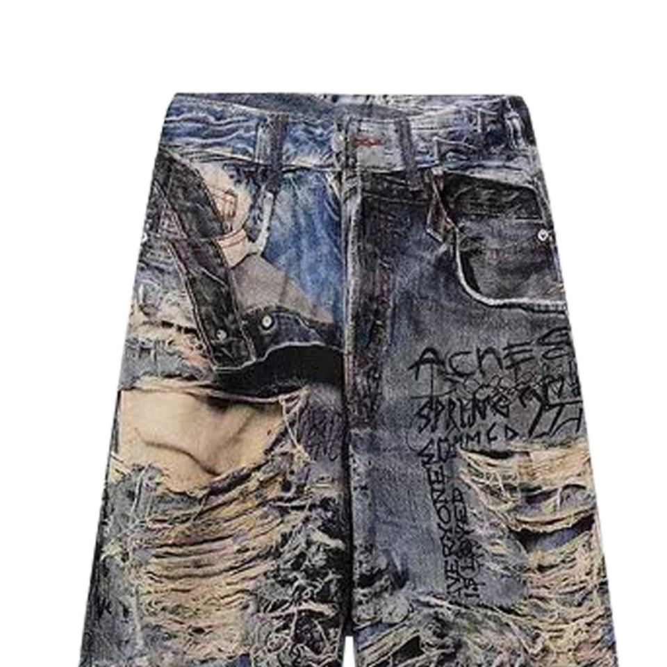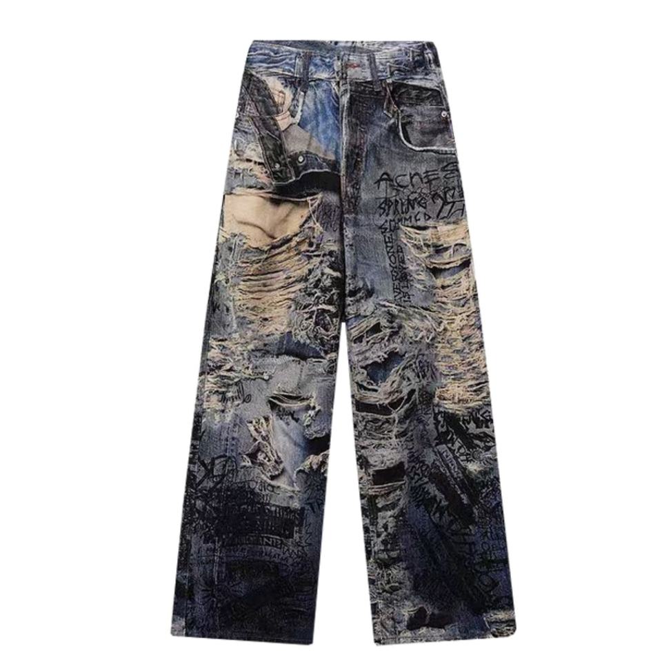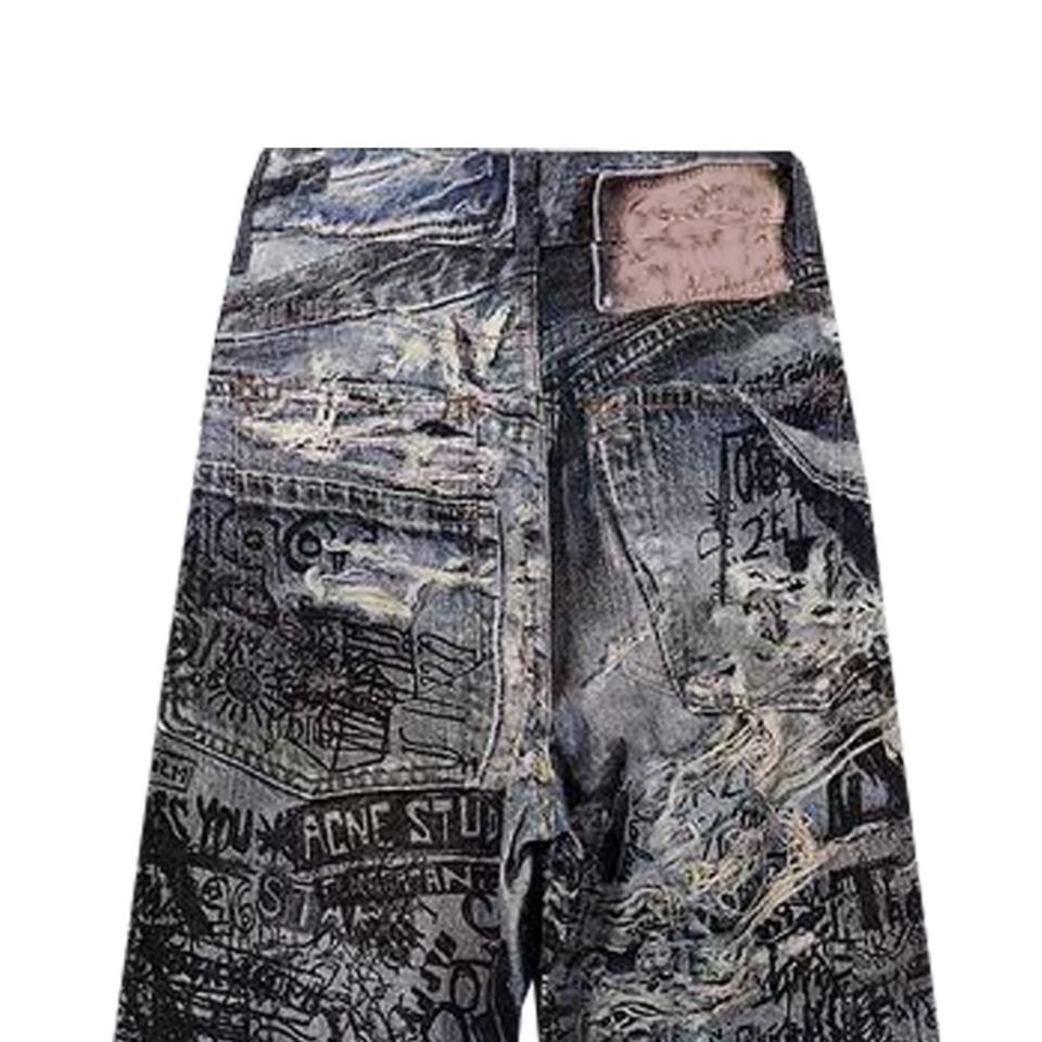 กางเกงยีนส์ผ้าฝ้ายลายกราฟฟิตีสไตล์เรโทรสำหรับผู้ชาย ลุคไฮสตรีท เหมาะสำหรับแฟชั่นสตรีทแวร์ Y2K และแฟชั่นลำลอง