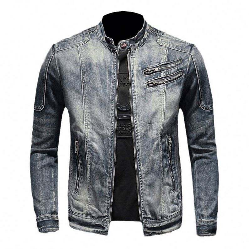 แจ็คเก็ตยีนส์ผู้ชายใหม่ สไตล์เรโทรสุดเทรนดี้ แฟชั่นลำลอง ปกตั้ง ซิปหน้า เท่ห์ สำหรับขี่มอเตอร์ไซค์ เสื้อผ้าเดนิม