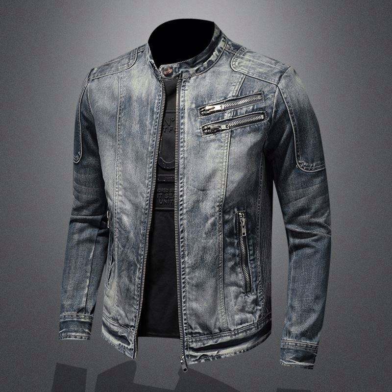 แจ็คเก็ตยีนส์ผู้ชายแบบใหม่ แฟชั่นย้อนยุคสุดเทรนดี้ แจ็คเก็ตซิปคอตั้งลำลอง เท่ห์สไตล์ไบค์เกอร์ เสื้อผ้าเดนิม