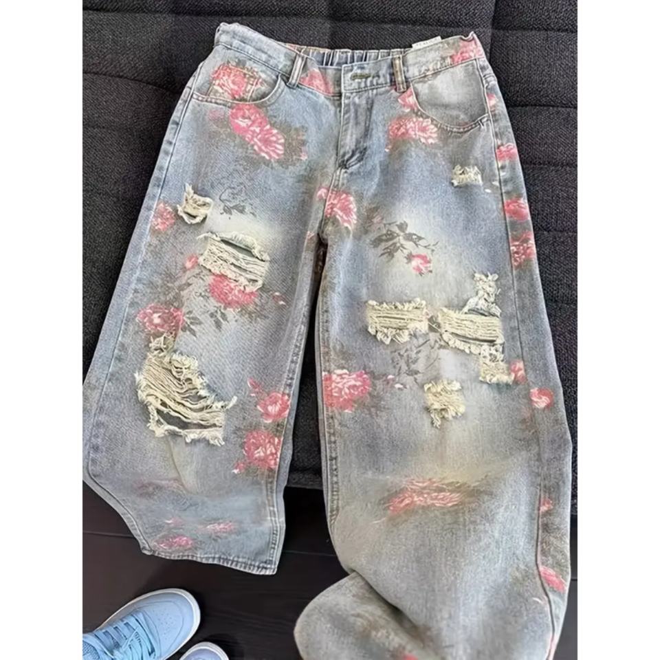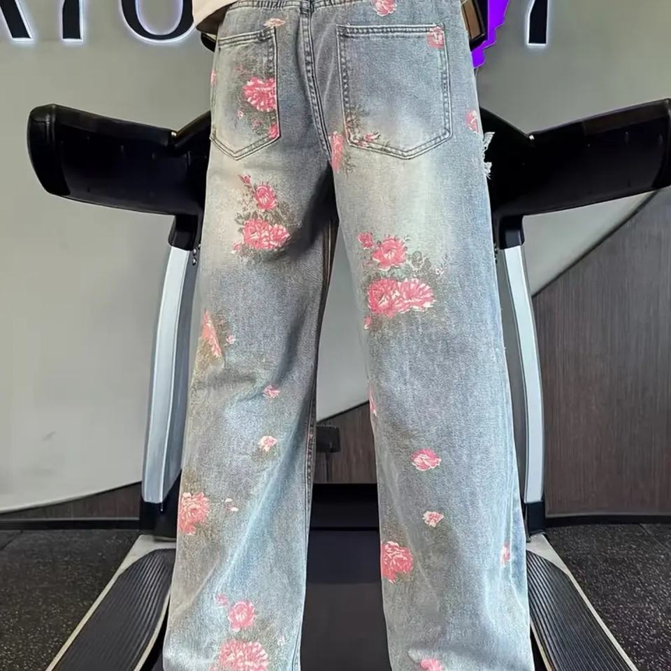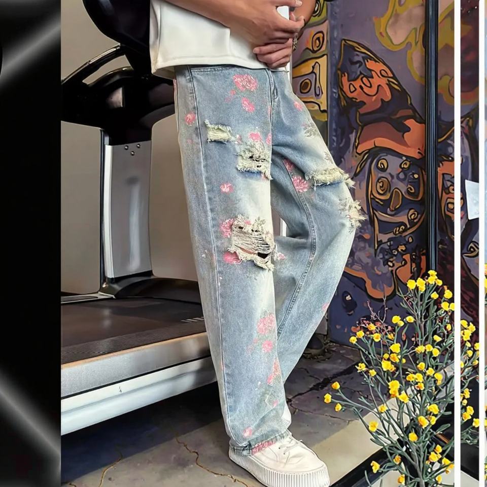 กางเกงยีนส์ลายดอกไม้สำหรับผู้ชายแบบใหม่ - ทรงขากว้าง สไตล์เรโทร สีฟ้าอ่อนฟอก เหมาะสำหรับสตรีทแวร์และเทรนด์แฟชั่นแนวศิลปะ