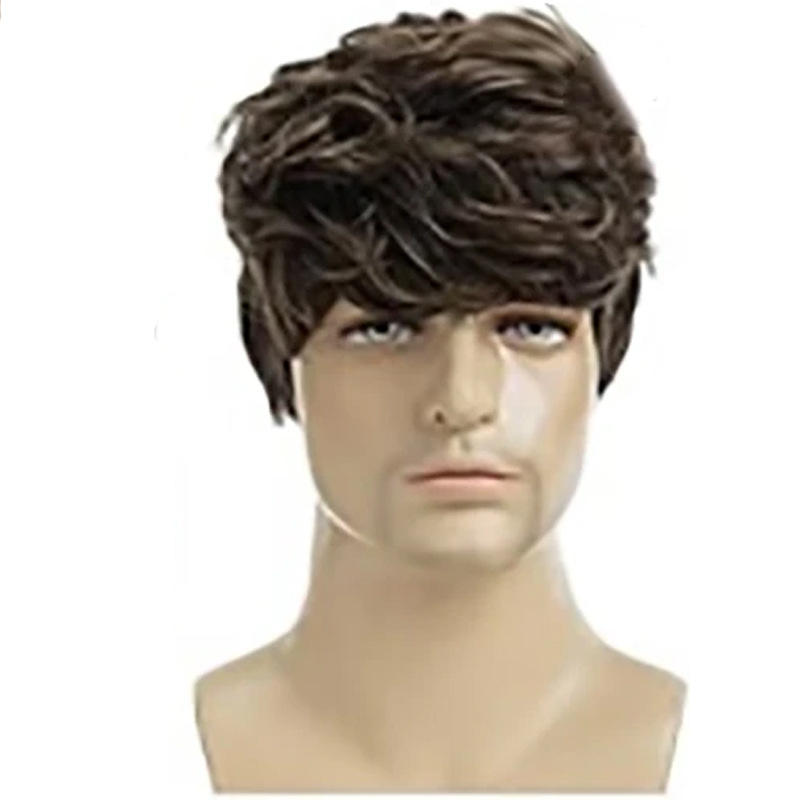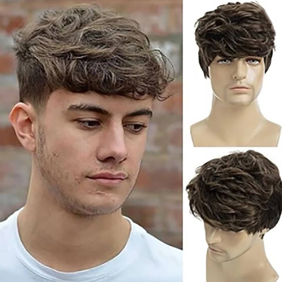 วิกผมผู้ชายสีน้ำตาล ผมสั้นหยิกธรรมชาติ ฐานวิกโปร่งใส ใยสังเคราะห์คาเนคาลอน สำหรับชาวยุโรปและอเมริกา