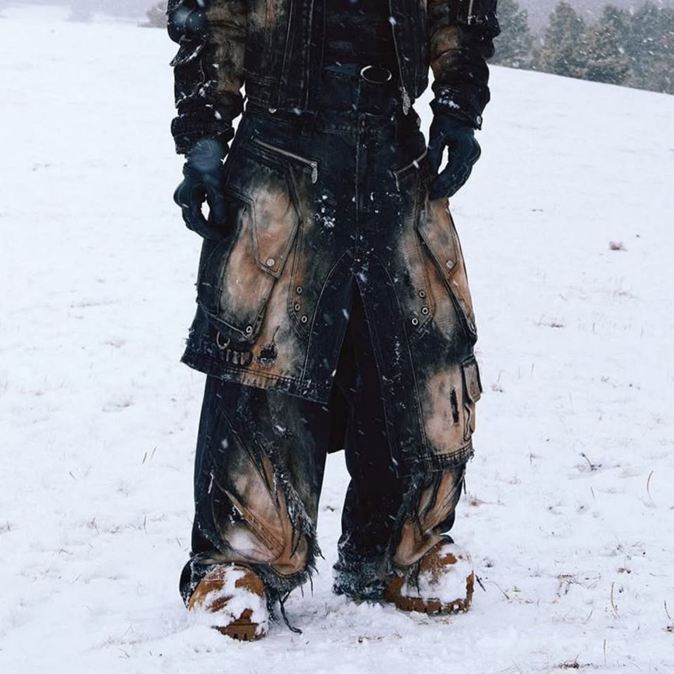 กางเกงทำงานยีนส์ทรงโอเวอร์ไซส์สำหรับผู้ชายรุ่นใหม่ ดีไซน์หลายชั้น เหมาะสำหรับแฟชั่นแนวไซเบอร์พังก์และโกธิคสตรีท