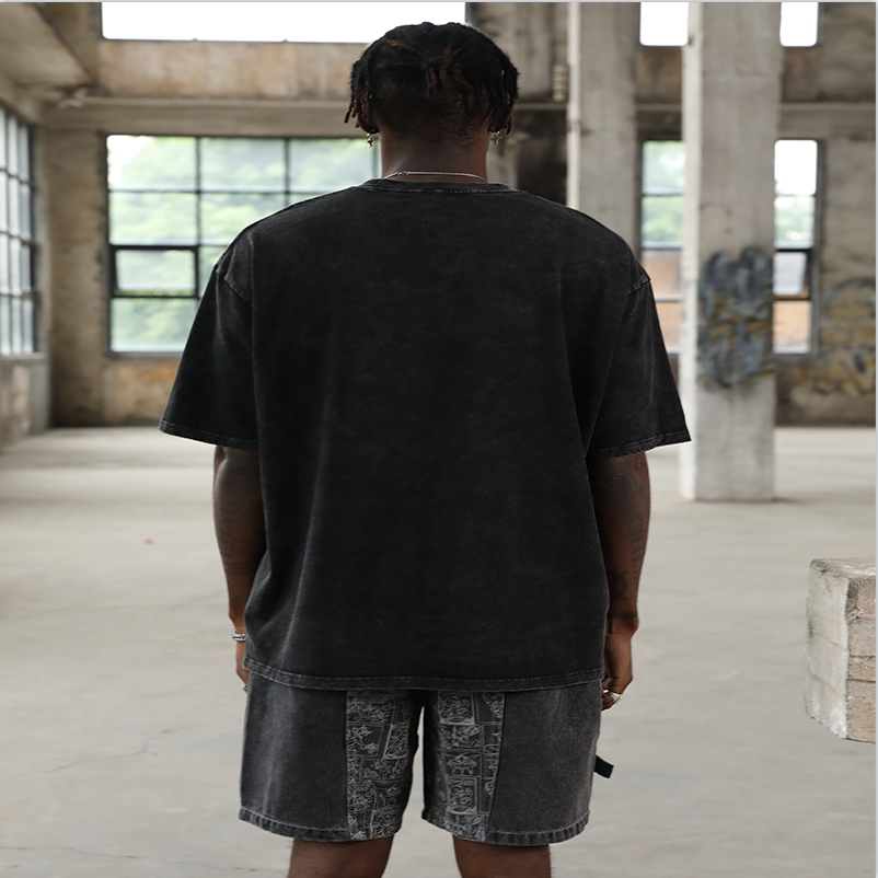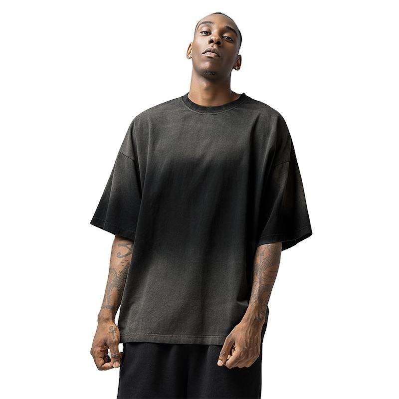 เสื้อยืดโอเวอร์ไซส์สีดำสำหรับผู้ชาย ลุควินเทจ ทำสีซีดแบบดิสเทรส พร้อมโลโก้ OEM ไซส์พลัส ผ้าคอตตอนหนา พิมพ์ลายตามสั่ง