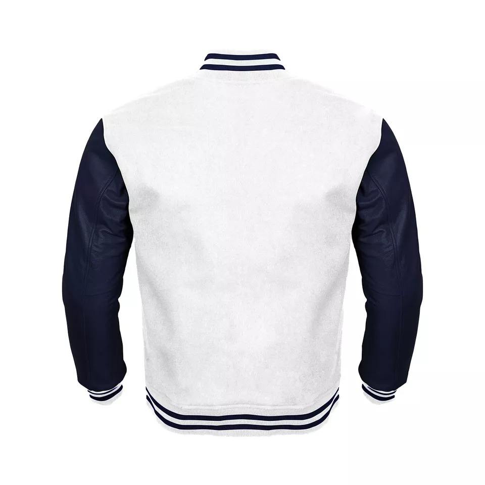 แจ็คเก็ตวาร์ซิตี้ผู้ชายแบบใหม่ แจ็คเก็ตเลตเตอร์แมน แจ็คเก็ตเบสบอล สีขาวตัวเสื้อ สีน้ำเงินหนัง แขนยาวเต็มตัว ปี 2025