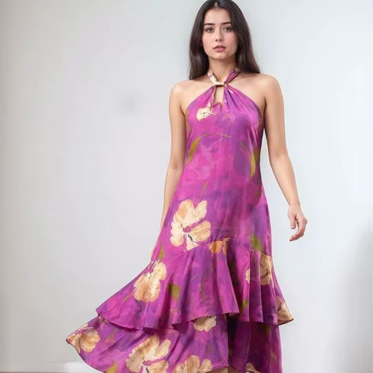 เดรสผ้าไหมลายดอกไม้เรขาคณิตสไตล์โบฮีเมียนความยาวปานกลาง พร้อมโลโก้ที่เอวแบบธรรมชาติ ระบายอากาศได้ดี พิมพ์ลายด้วยเทคนิคดิจิทัลสำหรับผู้หญิง