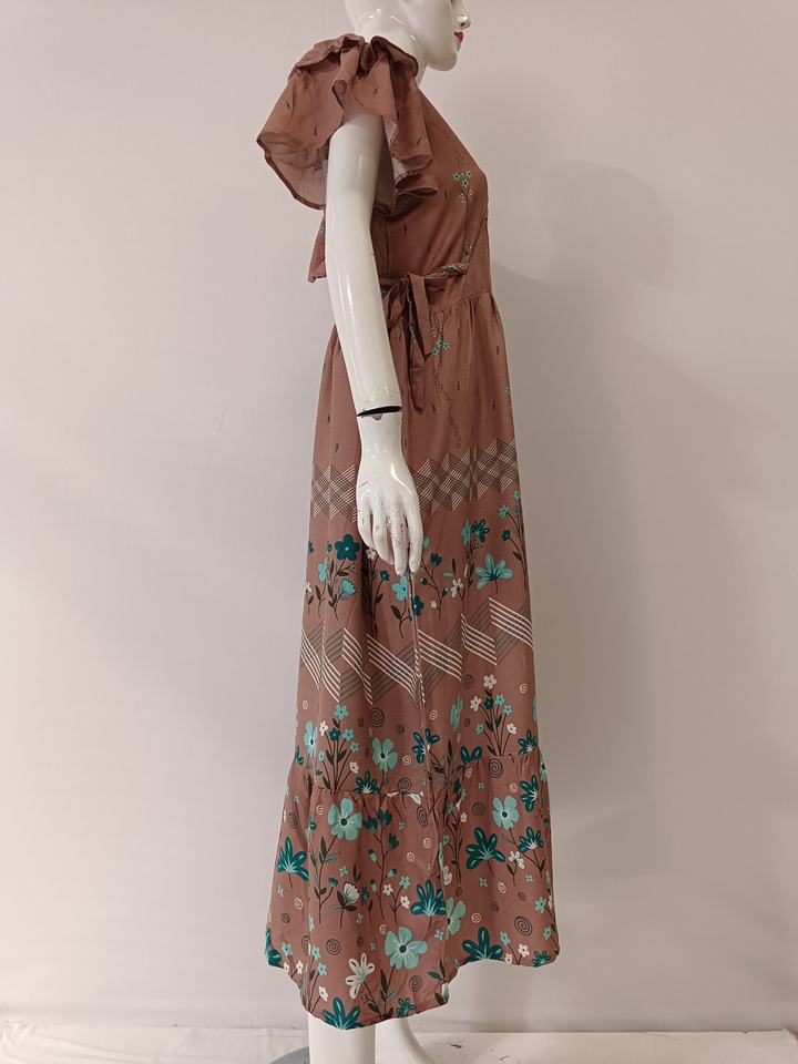 ชุดเดรสผ้าเรยอนลายดอกไม้ยาวถึงเข่าสำหรับฤดูร้อนเสื้อแขนเรียงซ้อนกันกระดุมด้านหน้าสายรัดด้านขวาและด้านซ้ายสไตล์ประจำวัน