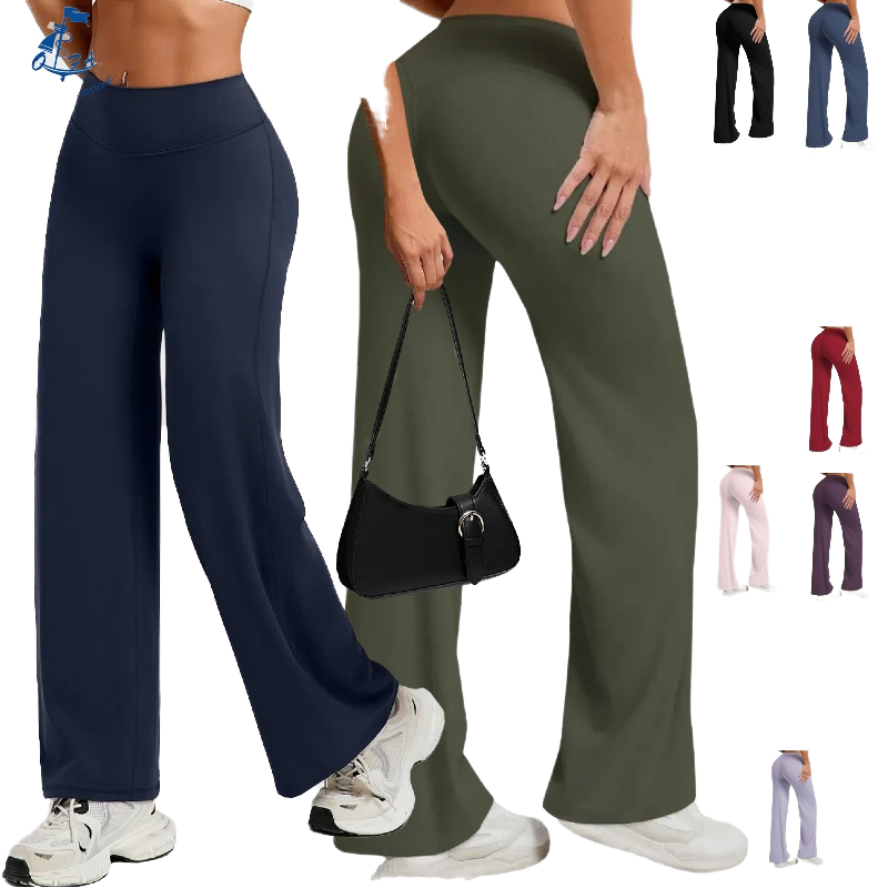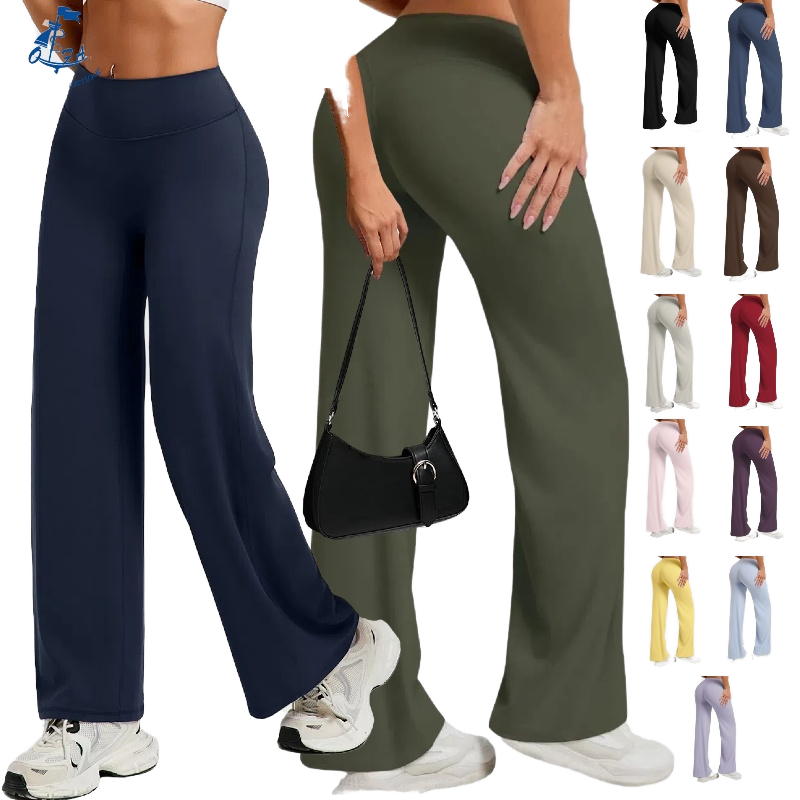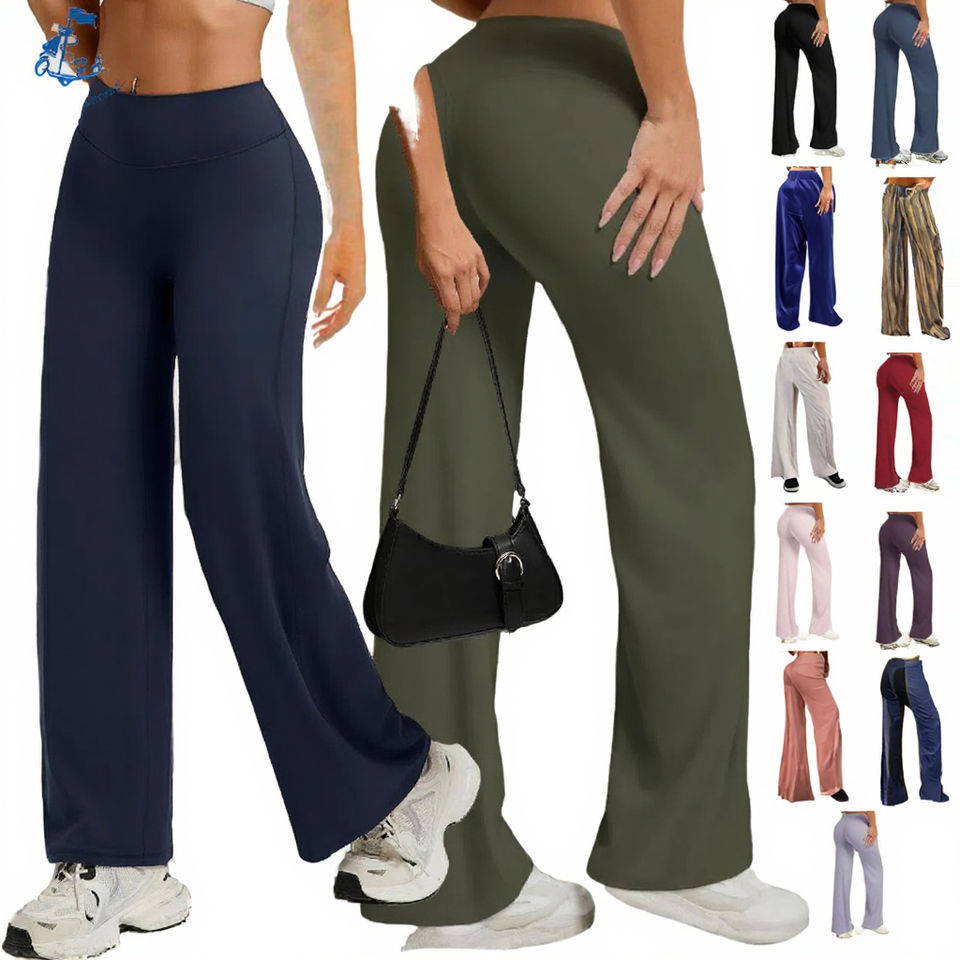 กางเกงโยคะทรงตรงรุ่นใหม่ เนื้อผ้านุ่มลื่นแบบเนย เอวกลางสำหรับผู้หญิง กางเกงเลกกิ้งออกกำลังกาย กางเกงฟิตเนสขาบาน กางเกงกีฬา มีโลโก้
