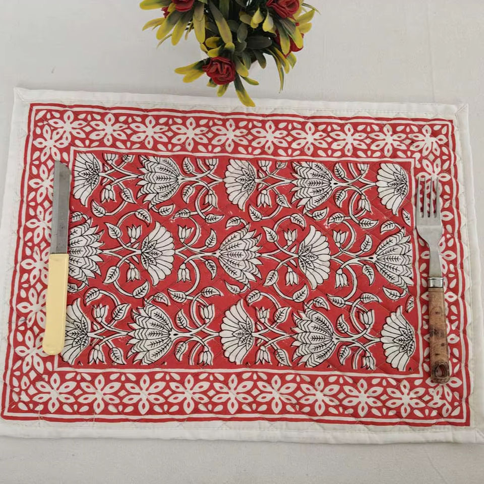 ที่รองจานผ้าฝ้ายทรงสี่เหลี่ยมผืนผ้าทรงสี่เหลี่ยมผืนผ้าสีแดงลายดอกไม้สำหรับ100% แบบใช้แล้วทิ้งและนำกลับมาใช้ใหม่ได้ตกแต่งโต๊ะอาหารในบ้านและห้องครัว