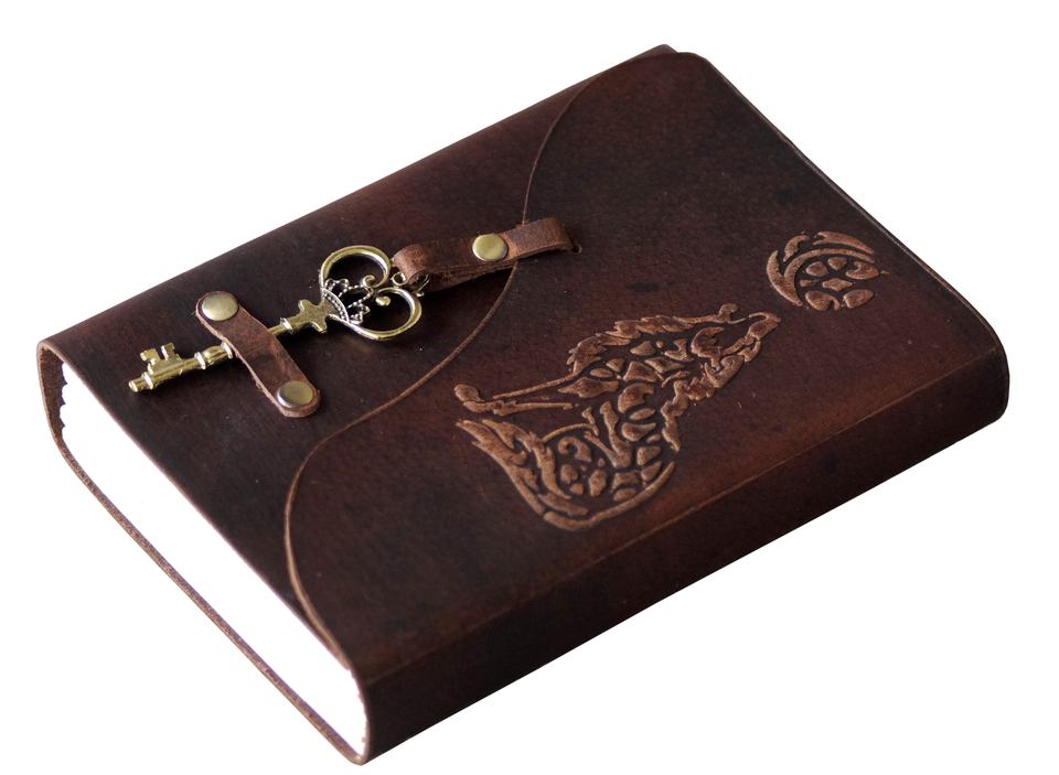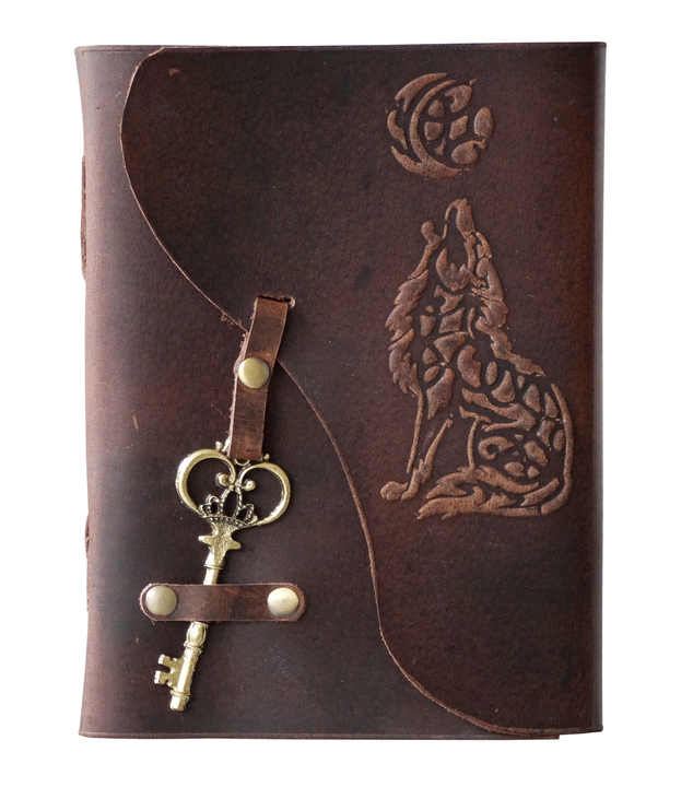 สมุดบันทึกปกหนังแท้งานแฮนด์เมดลายนูนรูปหมาป่าพระจันทร์ใหม่สมุดปก A5กระดาษเปล่าสีขาวสมุดโน้ตไดอารีพร้อมกุญแจและห่วงแบบโบราณ
