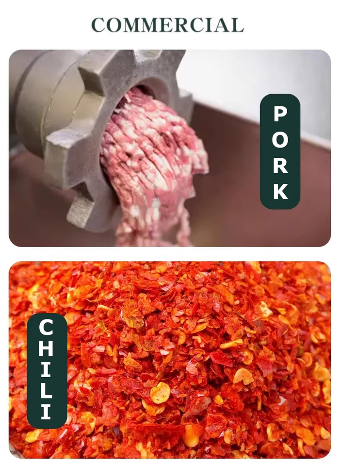 Application:Grind meat, grind chili peppers, make sausages, make rice cakes