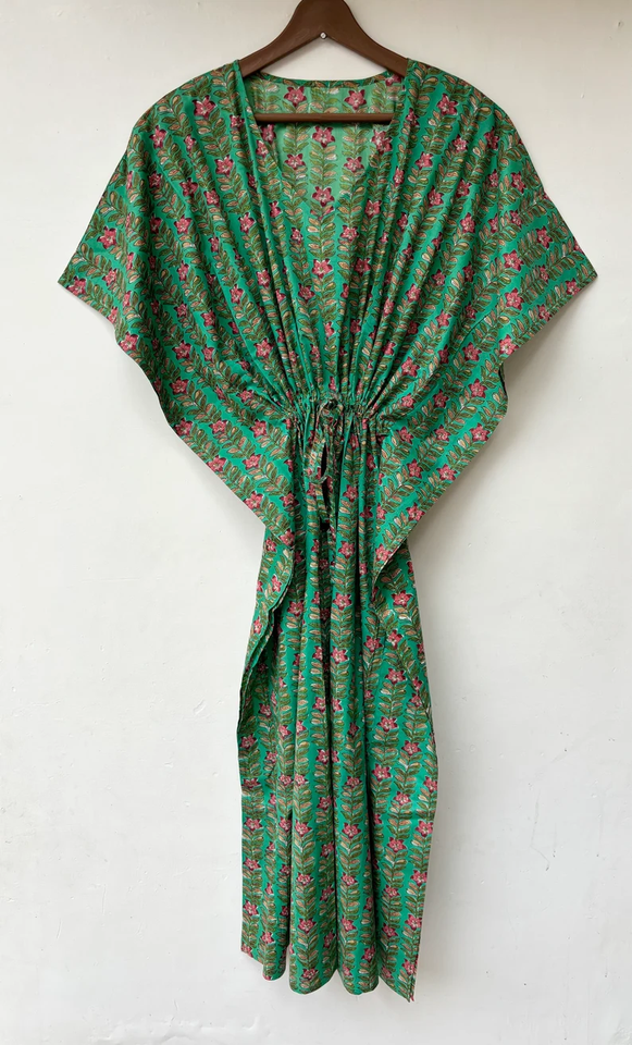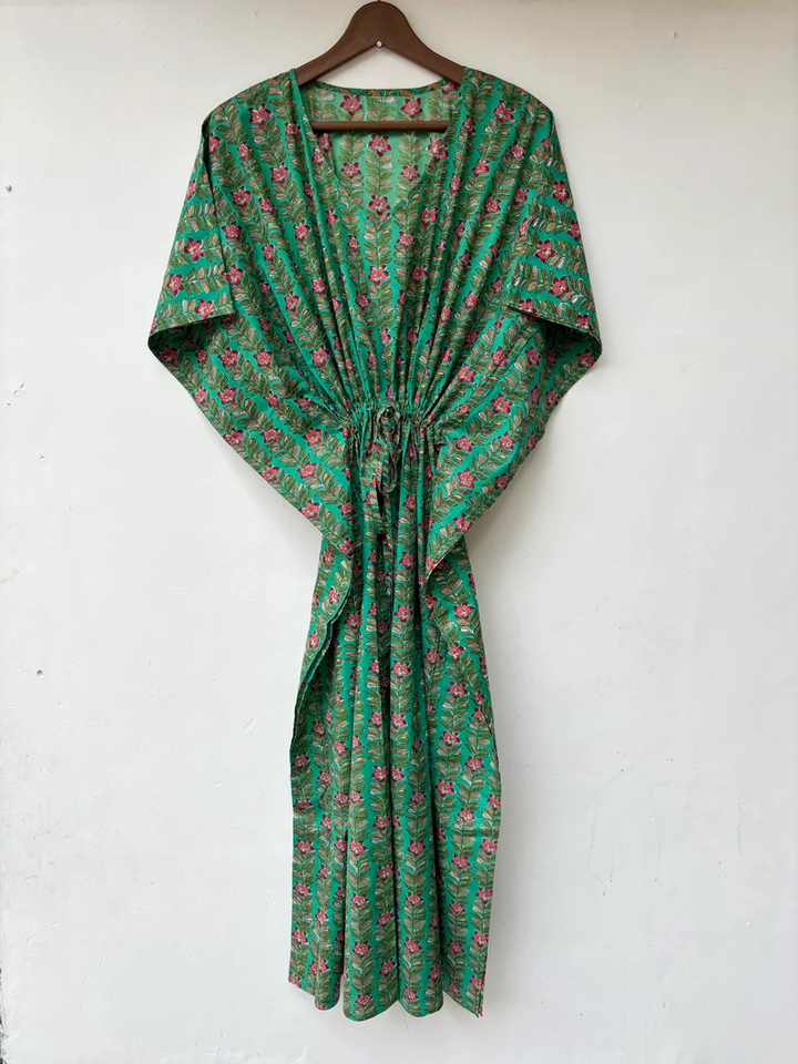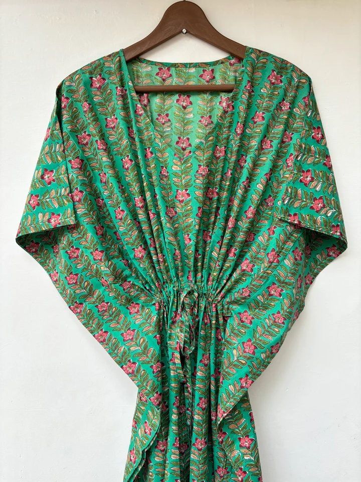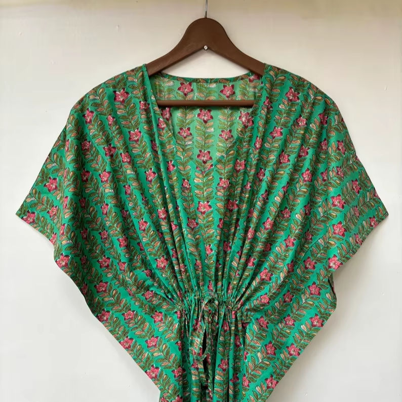 ชุดเดรสคาฟทันพิมพ์ลายสัตว์ คอวี แขนสั้น ผูกเชือก ทรงเข้ารูป กระโปรงบาน ผ้าฝ้ายอินเดีย 100% เนื้อผ้าเรียบลื่น ใส่สบายสำหรับฤดูร้อน แต่งลูกไม้ สำหรับผู้หญิง