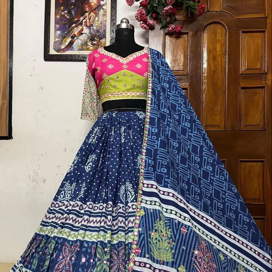 ชื่อผลิตภัณฑ์:Lehenga choli dupatta พิมพ์ดิจิตอลผ้าฝ้ายมัสลินพิมพ์กระจกจริง