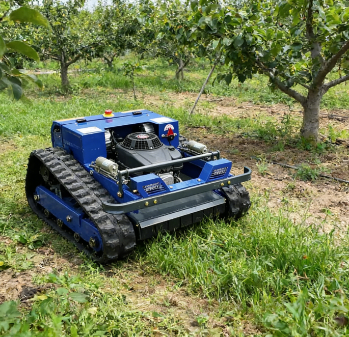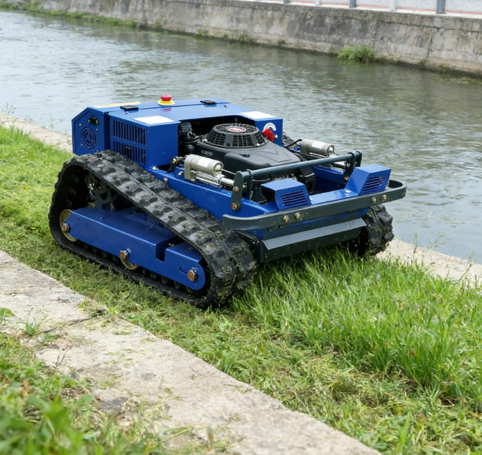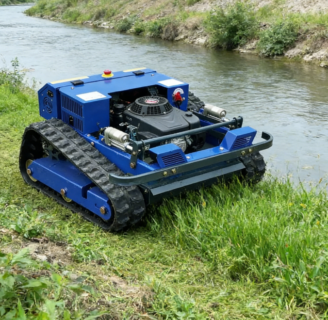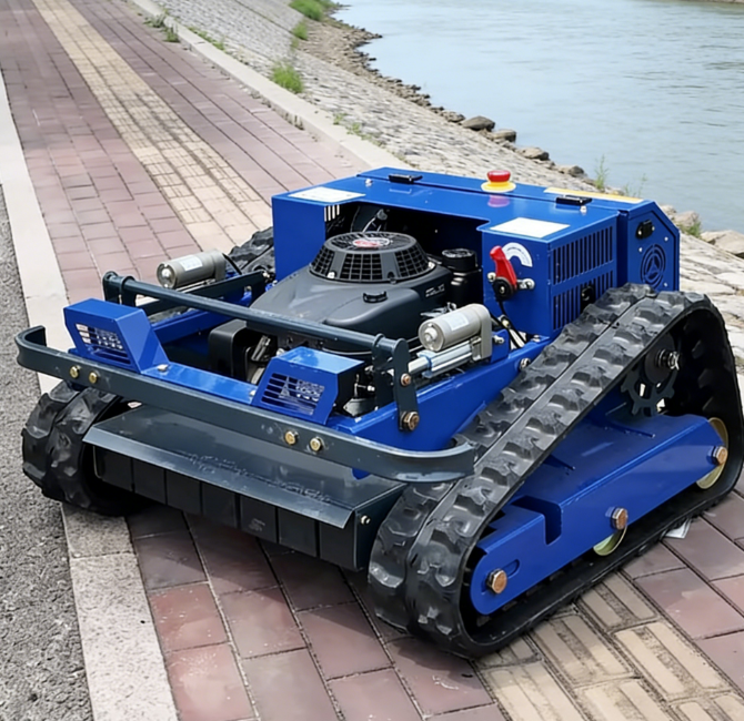 เครื่องตัดหญ้าหุ่นยนต์รุ่นใหม่ พร้อมรางตีนตะขาบสำหรับทุกสภาพพื้นผิว ดีไซน์ขนาดเล็ก ระดับอุตสาหกรรม ใช้เชื้อเพลิงเบนซิน ควบคุมด้วยรีโมท
