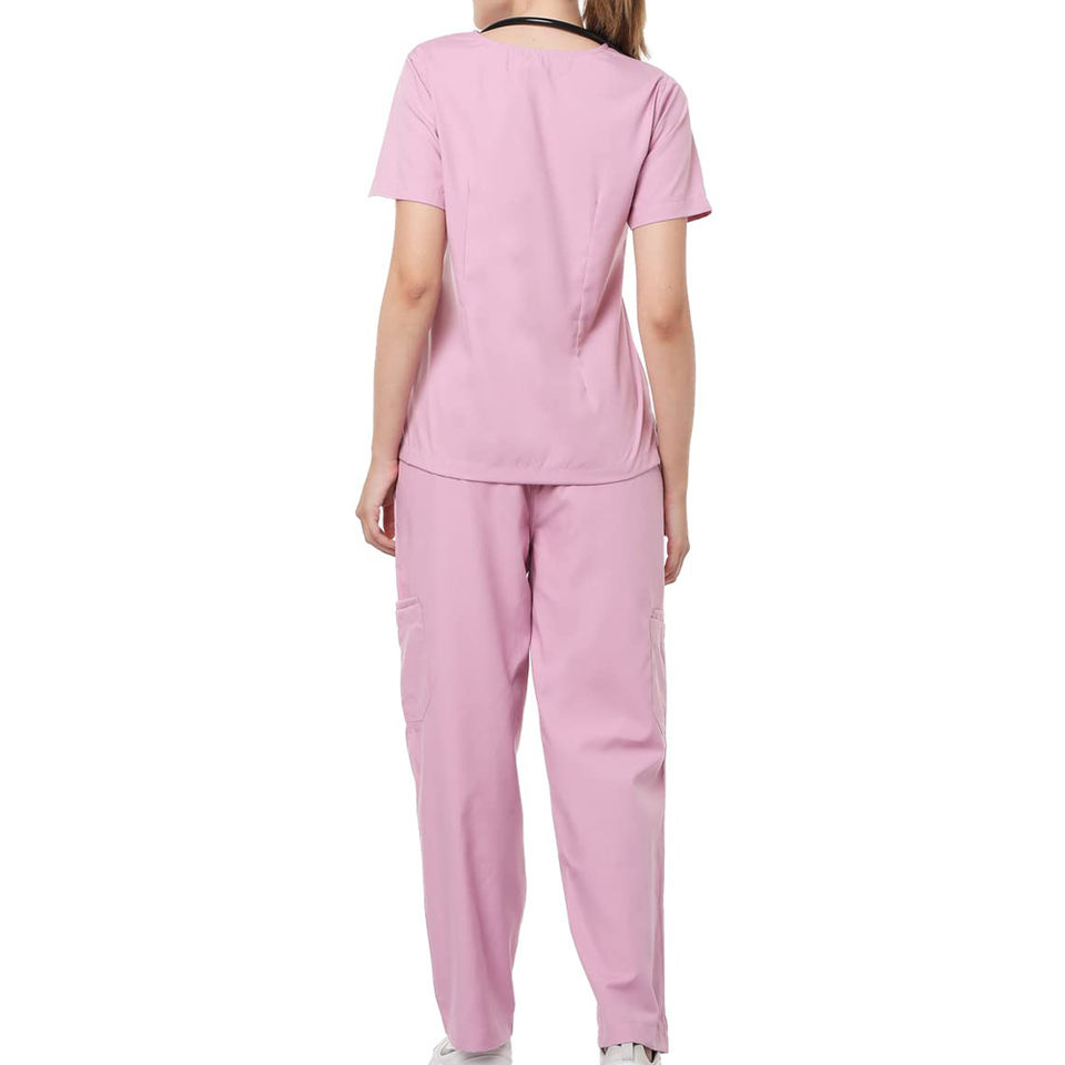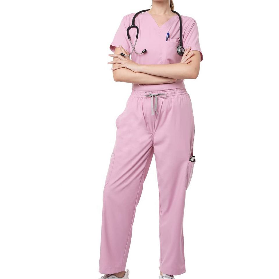 ชุดยูนิฟอร์มพยาบาลสีชมพูอ่อนแบบใหม่สำหรับผู้หญิง สวมใส่สบาย คอวี ชุดทำงานโรงพยาบาล มีกระเป๋า