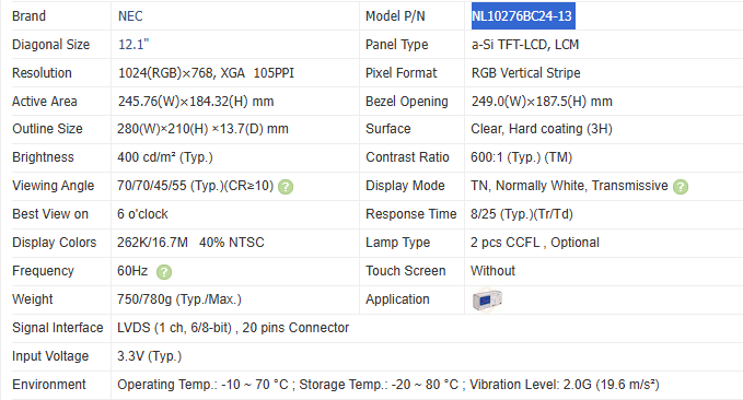 อินเทอร์เฟซ:LVDS (1 ช่อง, 6/8 บิต), คอนเน็กเตอร์ 20 พิน