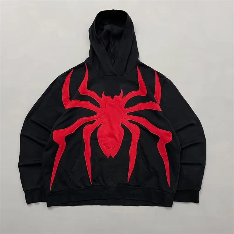 เสื้อฮู้ดสไตล์ฮิปฮอปแนวสตรีทลำลองสำหรับใส่กลางแจ้ง ลายพิมพ์หัวกะโหลกและแมงมุม สีพื้น เสื้อกันหนาวสำหรับผู้ชาย